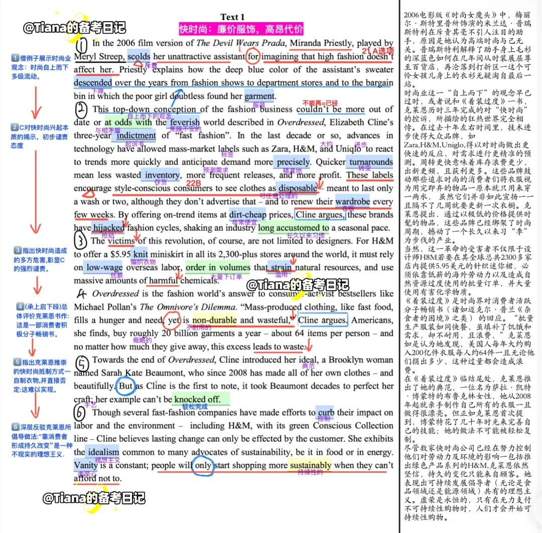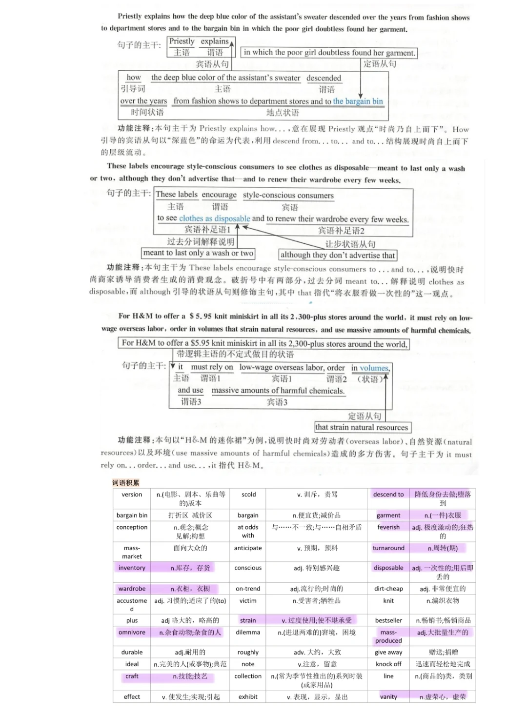 🌟作者对Cline以“批判快时尚”为主题的书作(着装过度》进行了介绍和评判。行文脉络:1⃣️文章引子(第一段)一2⃣️介绍Cline对快时尚的谴责(第二、三段)—3⃣️评判Cline提出的快时尚应对之道(第四至六段)。