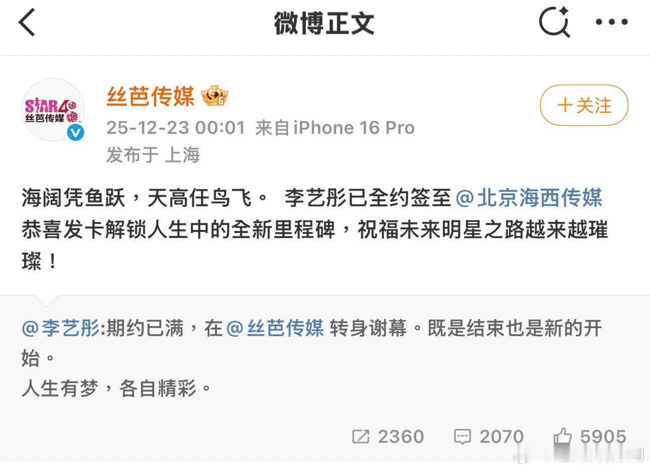 李艺彤在30岁生日官宣和丝芭合约已满,丝芭转发祝福并宣布李艺彤全约签到了海西传媒