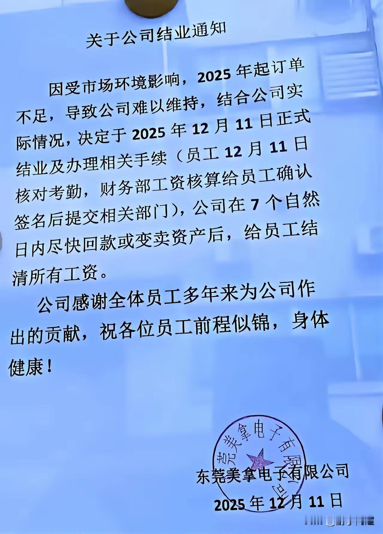 近日,东莞市横沥镇的一家港资企业宣布变卖资产,用以结清员工工资。 东莞美拿电子厂于2013年成立,主要生产pcb版、电脑相关产品。受近几年大环境影响,订单量下滑,企业经营困难,最终宣布倒闭。 该公司员工仅几百人。尽管公司破产,但老板并未跑路,而是发出通知,变卖公司资产来支付员工工资,不过员工的经济补偿大概率是没有了。 这位老板也算是体面退场了。