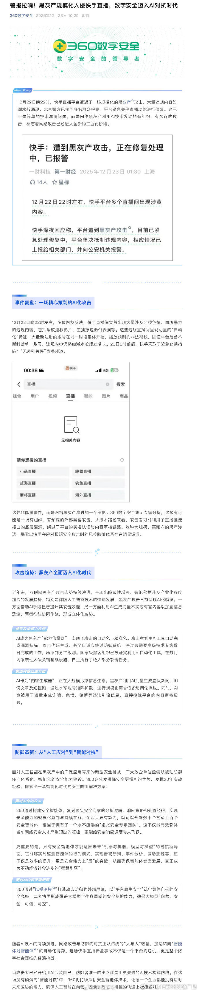 [#360复盘快手事件#]#360专家谈快手被攻击#12月22日晚22时,快手直播平台遭遇了一场规模化的黑灰产攻击,大量违规内容如潮水般涌现。北京警方已接到多名群众报案,平台紧急关停直播功能进行修复。这已不是简单的技术漏洞问题,而是网络黑灰产利用AI技术发动的有组织、有预谋的攻击,标志着网络攻击已经进入全新的工业化阶段。