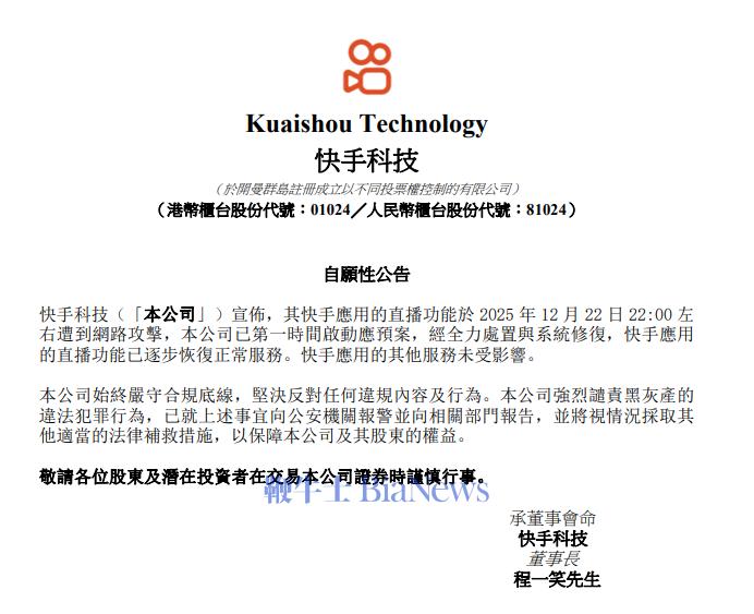 12月23日,快手发布公告称,公司快手应用的直播功能于2025年12月22日22:00左右遭到网路攻击,公司已第一时间启动应预案,经全力处置与系统修复,快手应用的直播功能已逐步恢复正常服务。快手应用的其他服务未受影响。