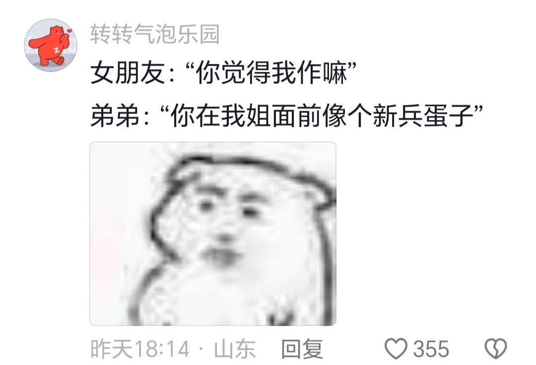 女朋友:“你觉得我作嘛” 弟弟:“你在我姐面前像个新兵蛋子’