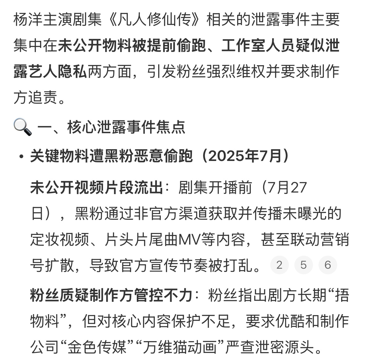 泄露的不只是成毅长安二十四计,杨洋凡人修仙传物料也偷跑了,当时好多人就提前踩剧。二十四计直接泄露了正片,人民的名义也是,太吓人了。严查吧。