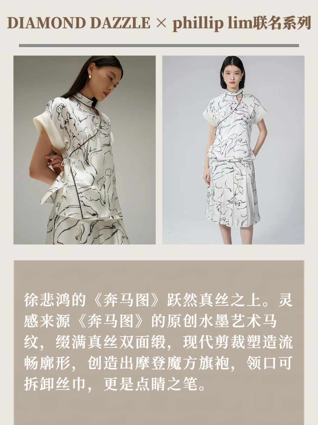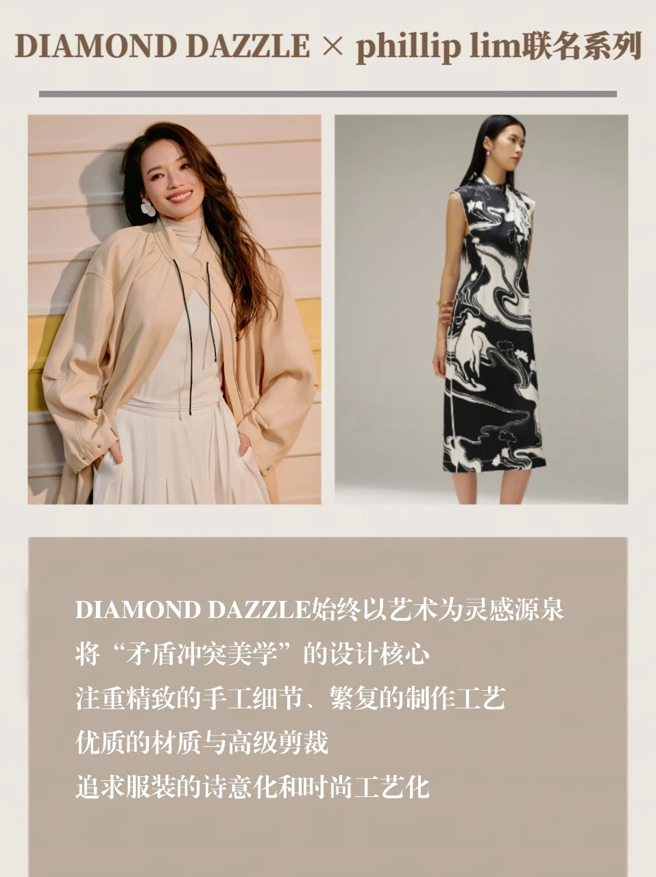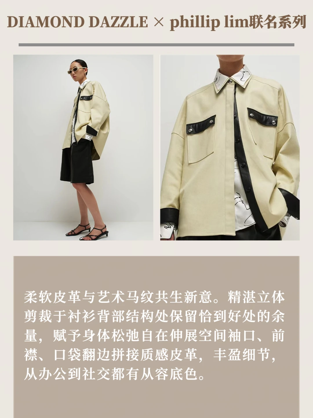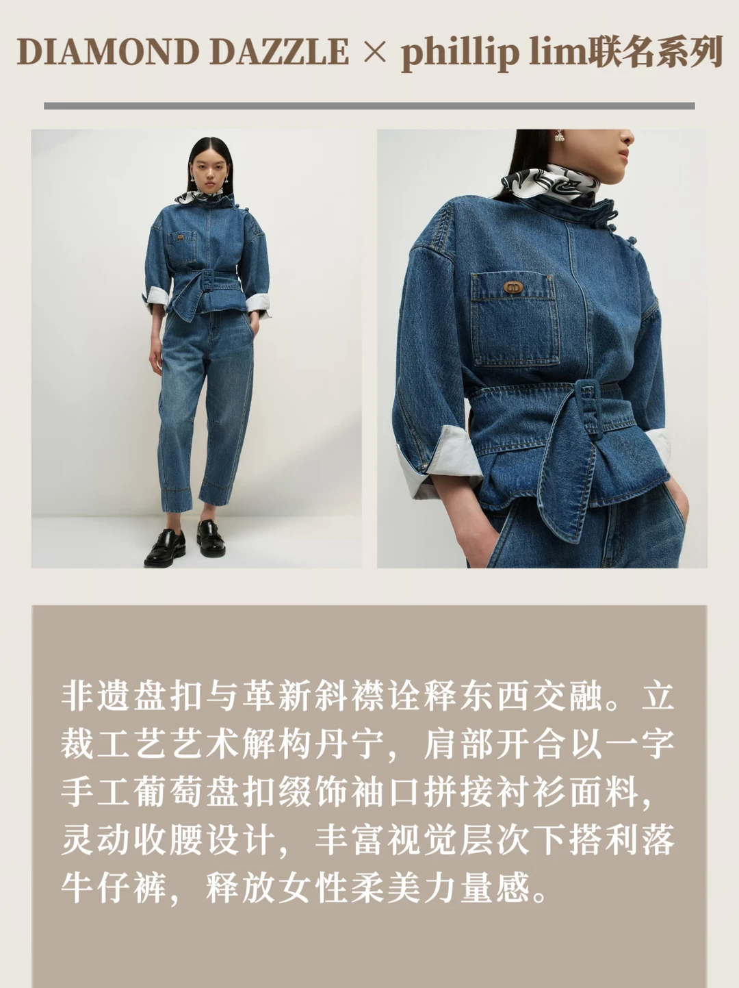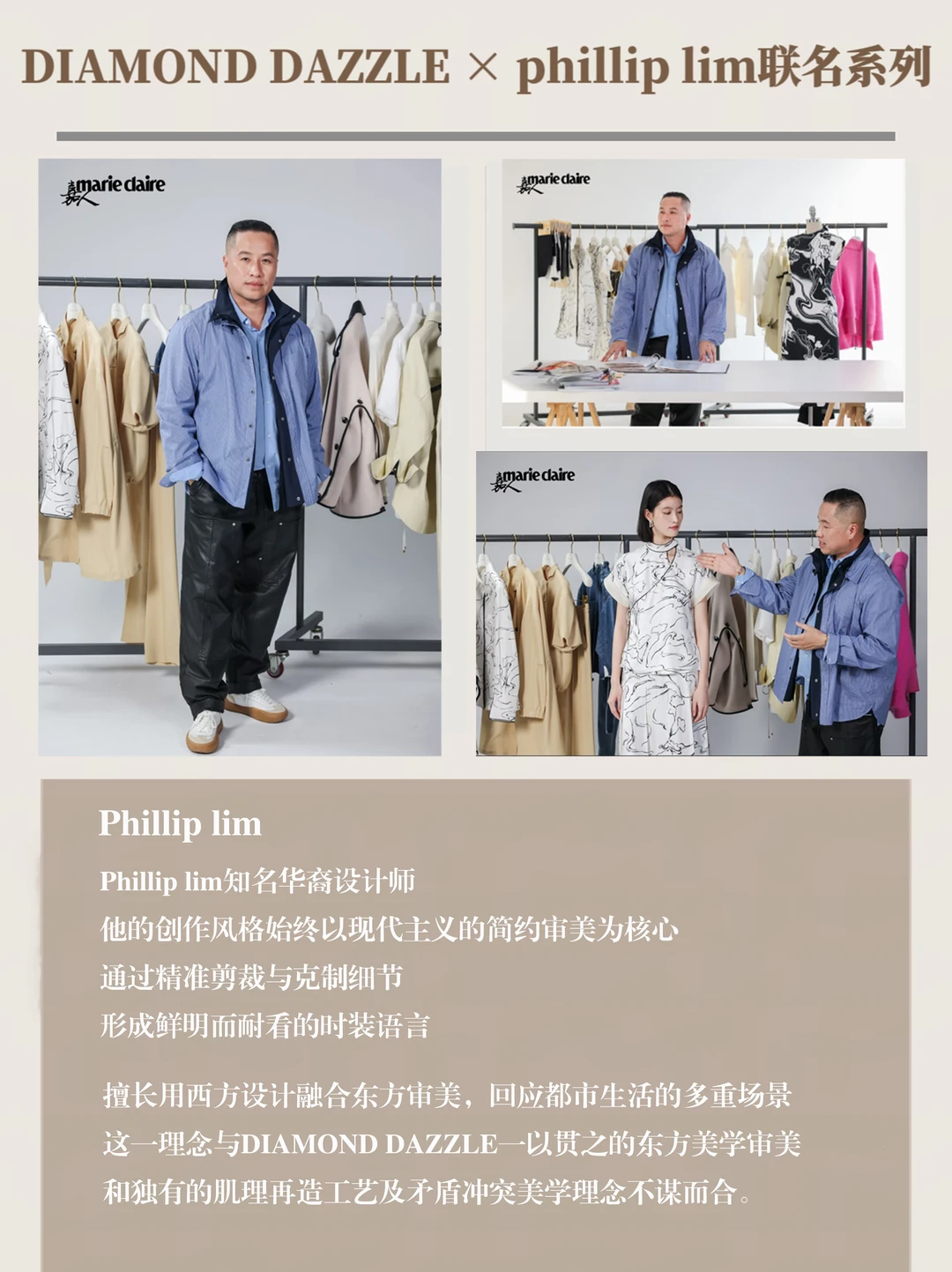 Phillip Lim是知名华裔设计师,他的创作风格始终以现代主义的简约审美为核心,通过精准剪裁与克制细节,形成鲜明而耐看的时装语言;擅长用西方设计融合东方审美,回应都市生活的多重场景,这一理念与DIAMOND DAZZLE一以贯之的东方美学审美、独有的肌理再造工艺及矛盾冲突美学理念不谋而合。于是此次DIAMOND DAZZLE×phillip lim联名系列中,可以看到: