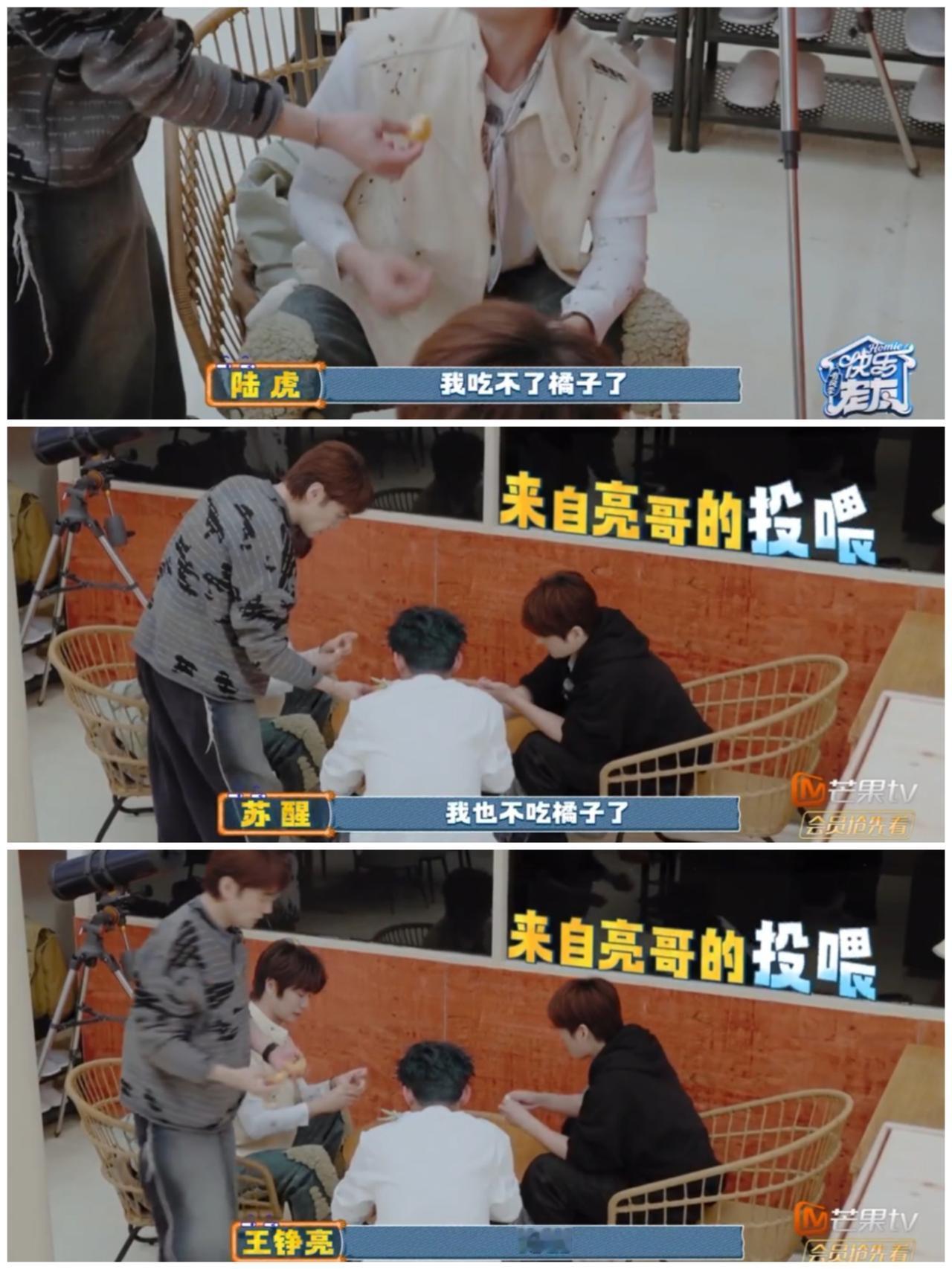 王铮亮都这样了, 陆虎,苏醒太不给面子了, 只有张远 满满配合。 王铮亮把橘子剥好, 送到陆虎,苏醒的嘴边, 但是他们都直接拒绝。 哎呀, 一般人面对送到嘴边的“投喂”, 就算忌口, 都会给面子吃下去, 而陆虎,苏醒偏不, 直接拒绝。 而王铮亮也识趣转身离开, 一点都没有不高兴的样子。 由此可见, 他们之间的感情是多么好, 敢于拒绝对方的好意, 可以勇敢说不, 也不会有一丝的不理解与不开心, 完全就是家人的相处状态。 而张远的行为更加加分, 在陆虎,苏醒拒绝吃橘子的情况下, 张远把头伸过去, 迫不及待, 满心高兴接受王铮亮的“投喂”。 不知道张远是否真的想吃橘子, 但是他这个行为, 真的很暖心。 在王铮亮被陆虎,苏醒拒绝后, 满是尴尬时, 主动接受投喂。 让王铮亮感受到他的小贴心。 不是说陆虎,苏醒拒绝吃橘子不好, 他们真不想吃,就不吃, 不能强迫人家。 而是说张远的接受投喂, 稳稳接住王铮亮的善意, 更加温暖人心。 剪彩后,张远抓住刀口,生怕伤到他人, 王铮亮投喂橘子,他人拒绝,唯有张远稳稳接着。 张远真是在生活的每一个小细节头透着暖意, 跟这样的人做朋友真好。 但是张远总是考虑别人在先, 是否会感觉得到累呢?