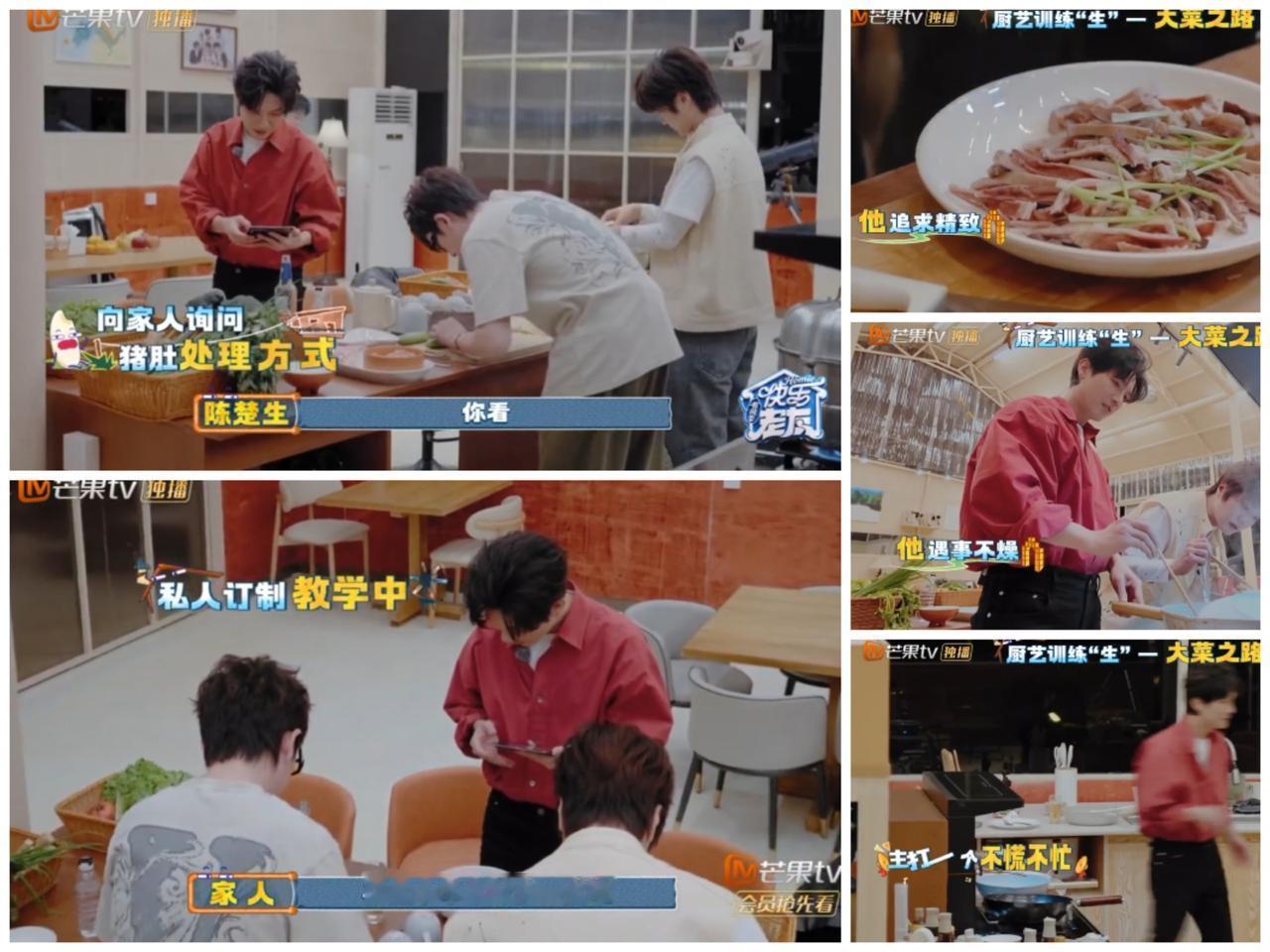 陈楚生录制节目, 看到这一幕, 知道原来他和儿子私下 是这样相处的呀。 陈楚生开录新综艺第一天, 准备给再就业男团做猪肚, 但是他不会做, 于是他请教妻子做猪肚的方法, 但是这个菜太难搞, 他都想喊“救命”了。 但是他没有放弃, 多次向妻子请教每个步骤, 就在他快失去耐心时, 儿子发来语音。 给他加油。 就这样, 其他人都把菜肴都做好了, 就剩下陈楚生没有完成他的猪肚。 但是他不急不躁, 慢悠悠的完成他的菜品, 还精致摆谱。 菜品完成后, 第一件事情 就是拍照发给家人。 由此可见, 他做事情,家人会细心帮忙, 遇到困难,孩子会给他暖心加油, 他也不急,按照自己的节奏完成工作, 情绪极其稳定。 哎呀, 那个年轻时, 一不开心就跟芒果台解约, 可以不顾后果 直接从跨年夜缺席压轴演出的 我行我素的陈楚生, 在多年后, 蜕变成一个有担当, 遇事淡定的居家好男人。 也许从他的儿子一句奶声奶气的 “加油”声中可以找到答案。