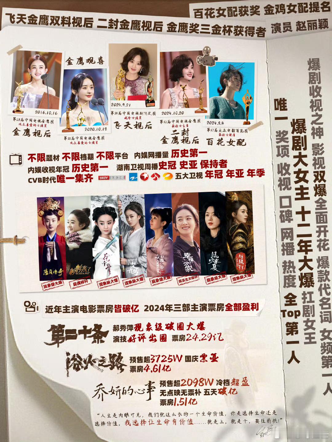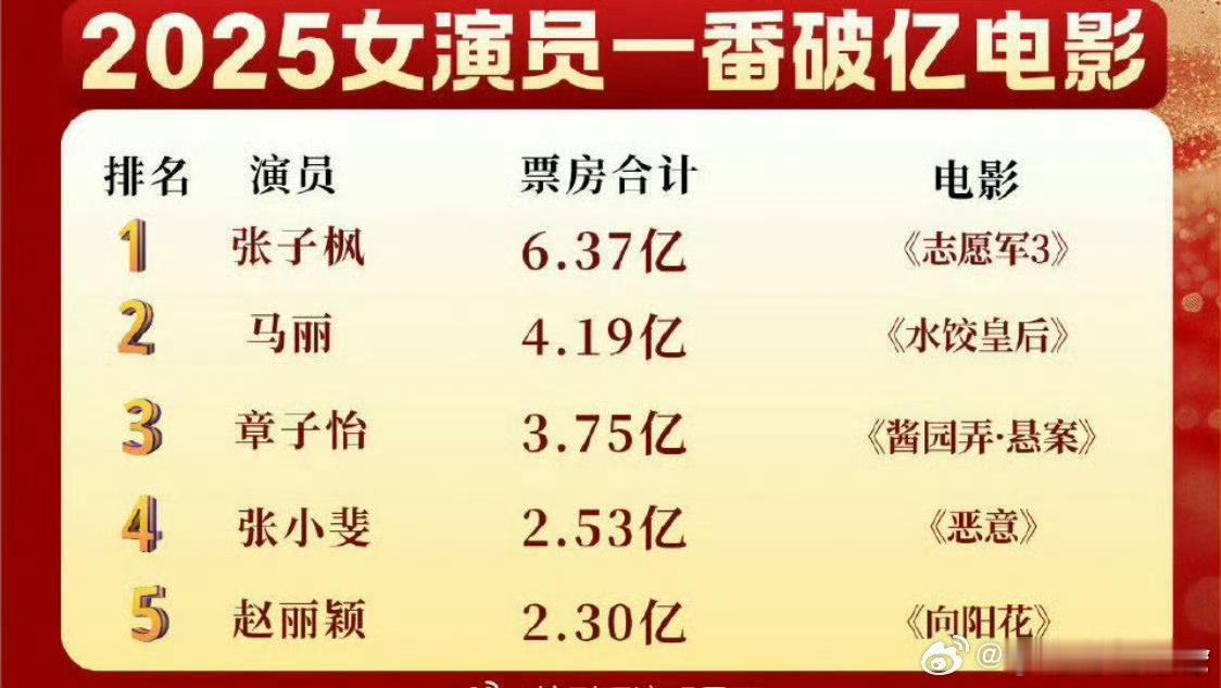 恭喜赵丽颖2025最具票房号召力女演员获得第一,毋庸置疑的第一,《乔妍的心事》冷档期票房1.51亿超盈利;《向阳花》清明票房冠军票房2.30亿;《浴火之路》国庆档亚军票房4.61亿!今年一番破亿电影就五位,85花就两位