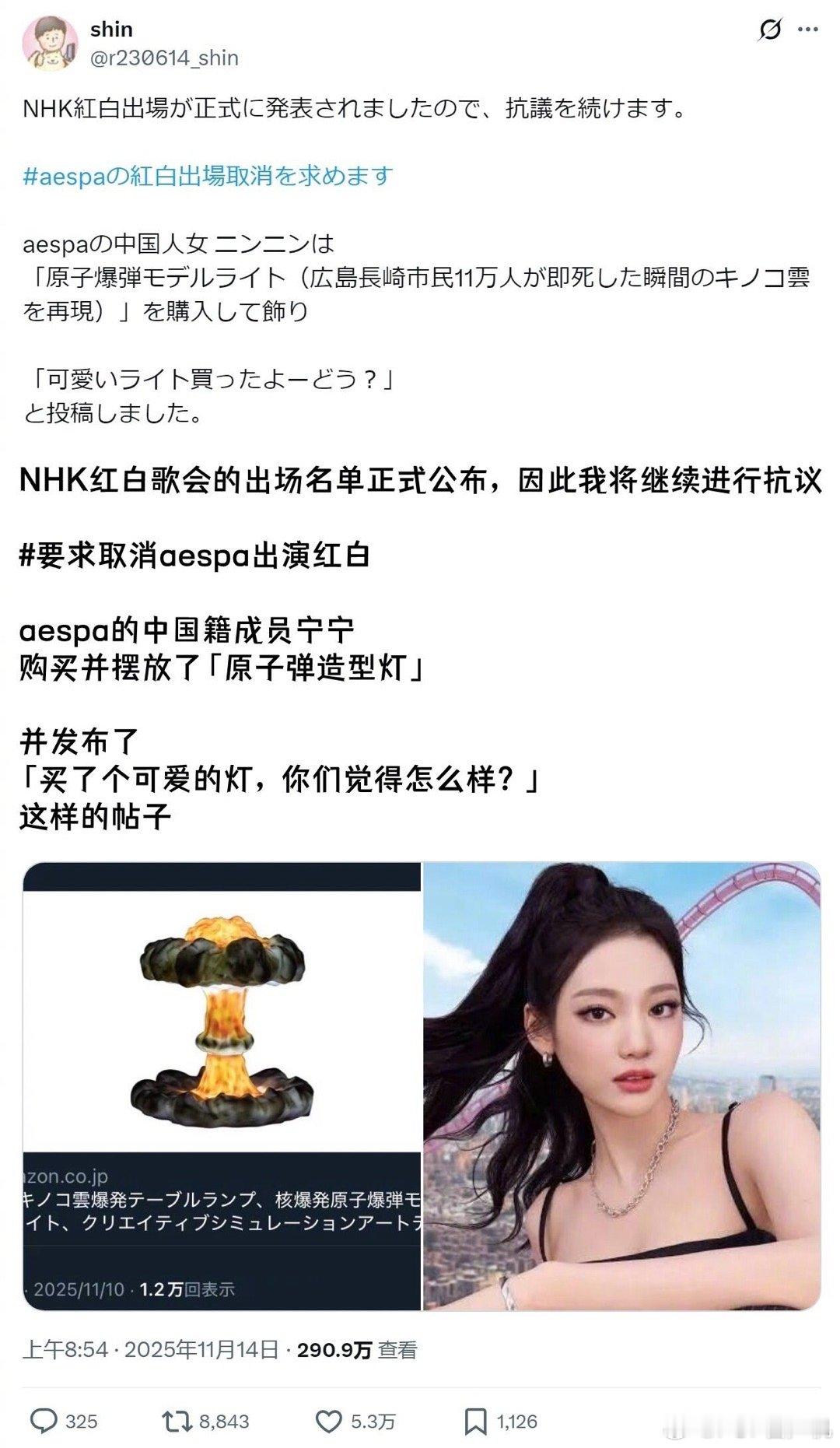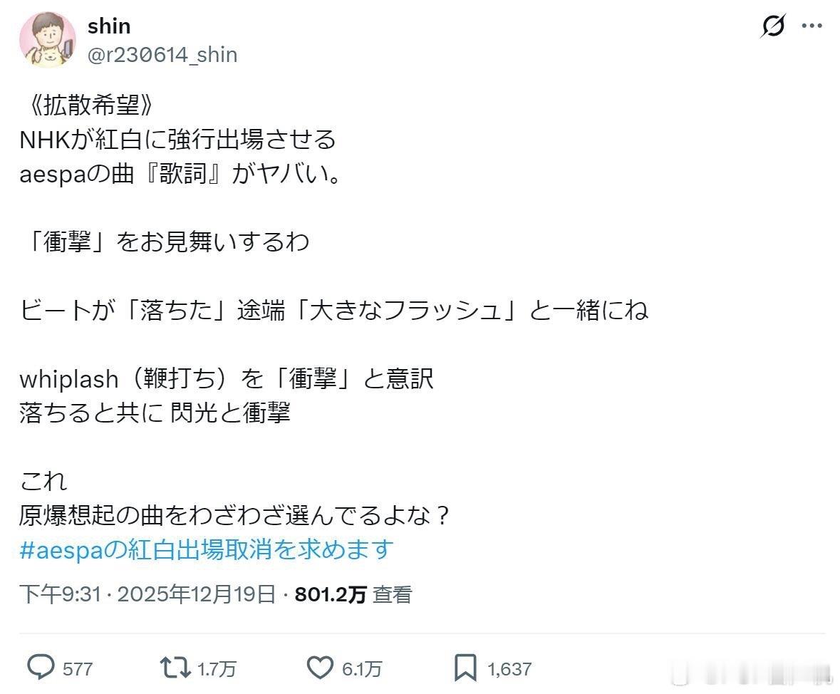 日本网红将13万拒aespa上红白的联署签名册送到NHK窗口被拒收此外,她们将在红白歌会上演唱的歌曲「Whiplash」歌词也被指带有影射歌词内容:One look give 'em Whiplash、Beat drop with a big flash“让他们感受到鞭击般的冲击,在节拍落下的瞬间,伴随着巨大的闪光”