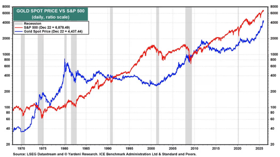 “黄金价格正迅速逼近标普500指数。如果标普500指数如我们预期在2029年底达到10000点,那么在我们的趋势分析正确的情况下,黄金价格也应达到10000美元,”YardeniResearch团队表示。