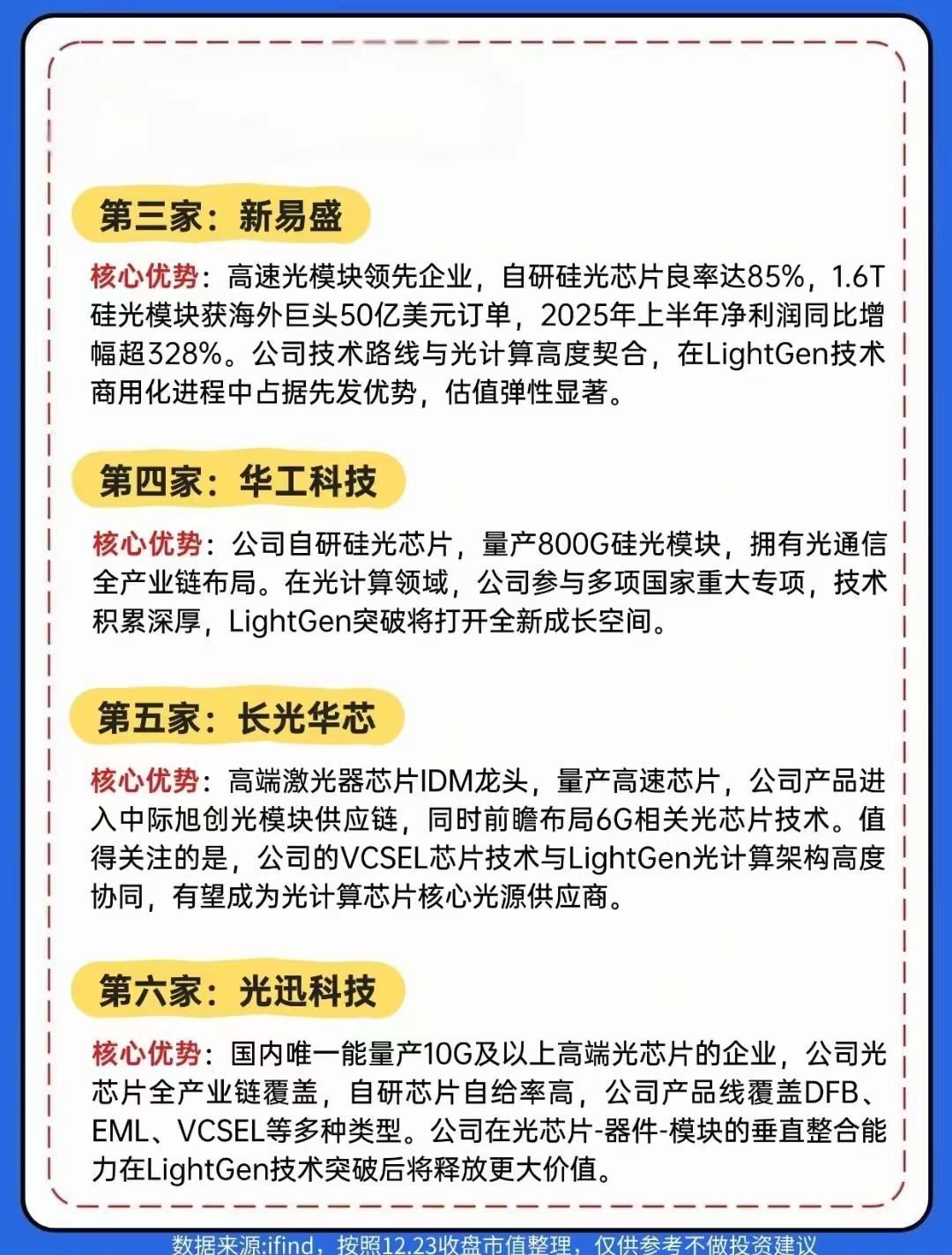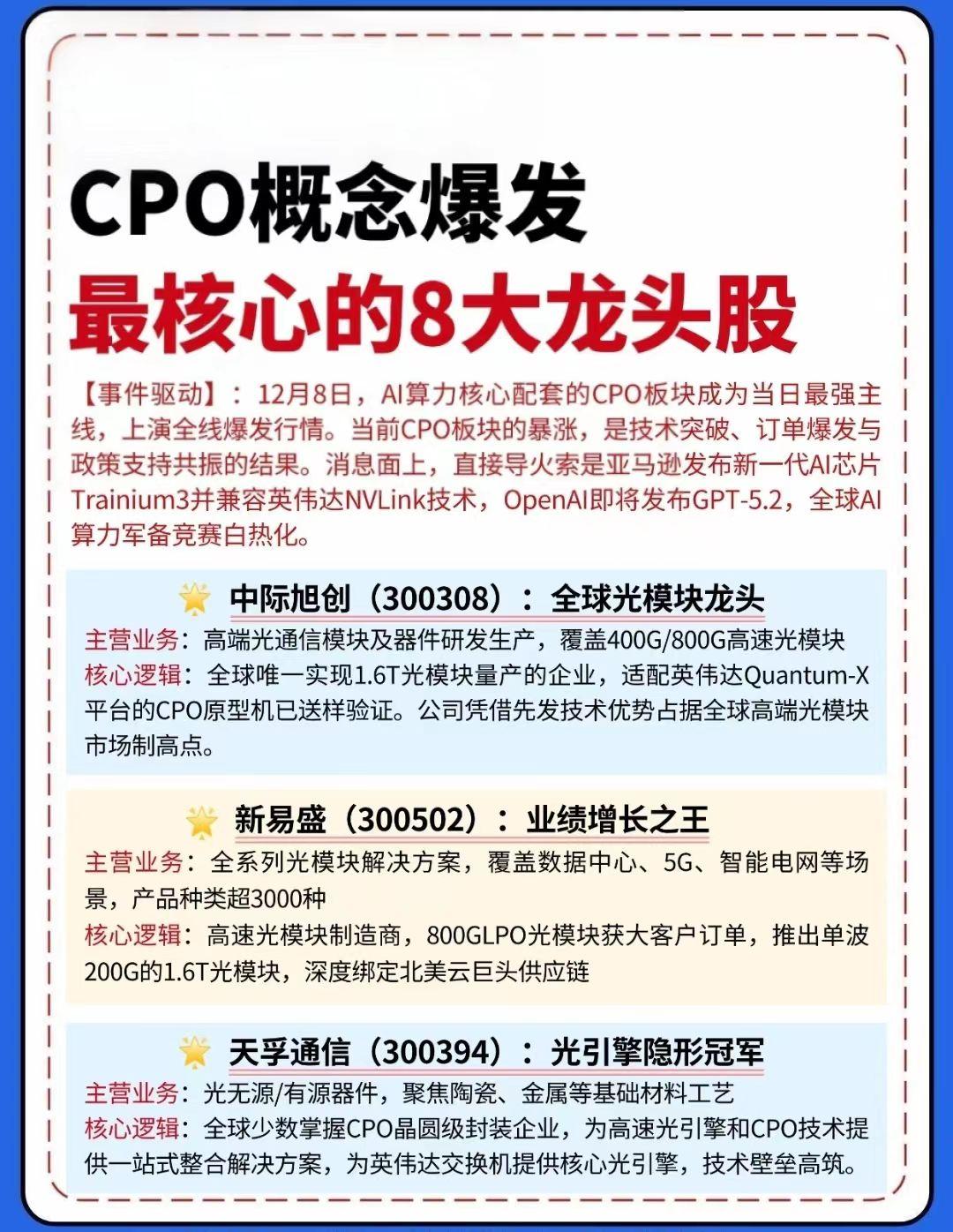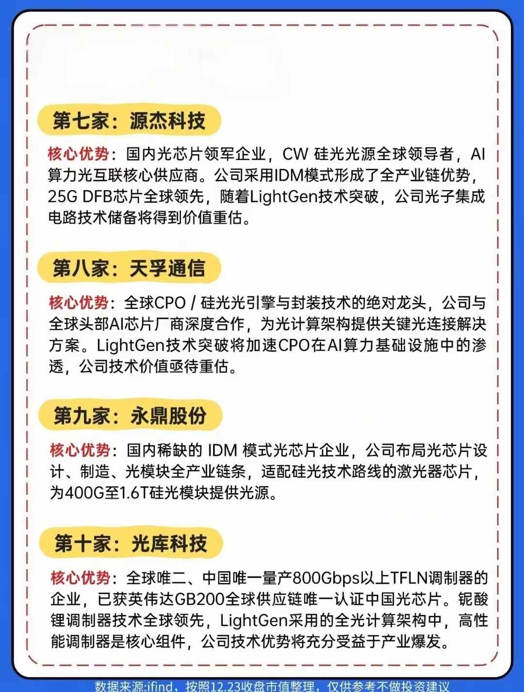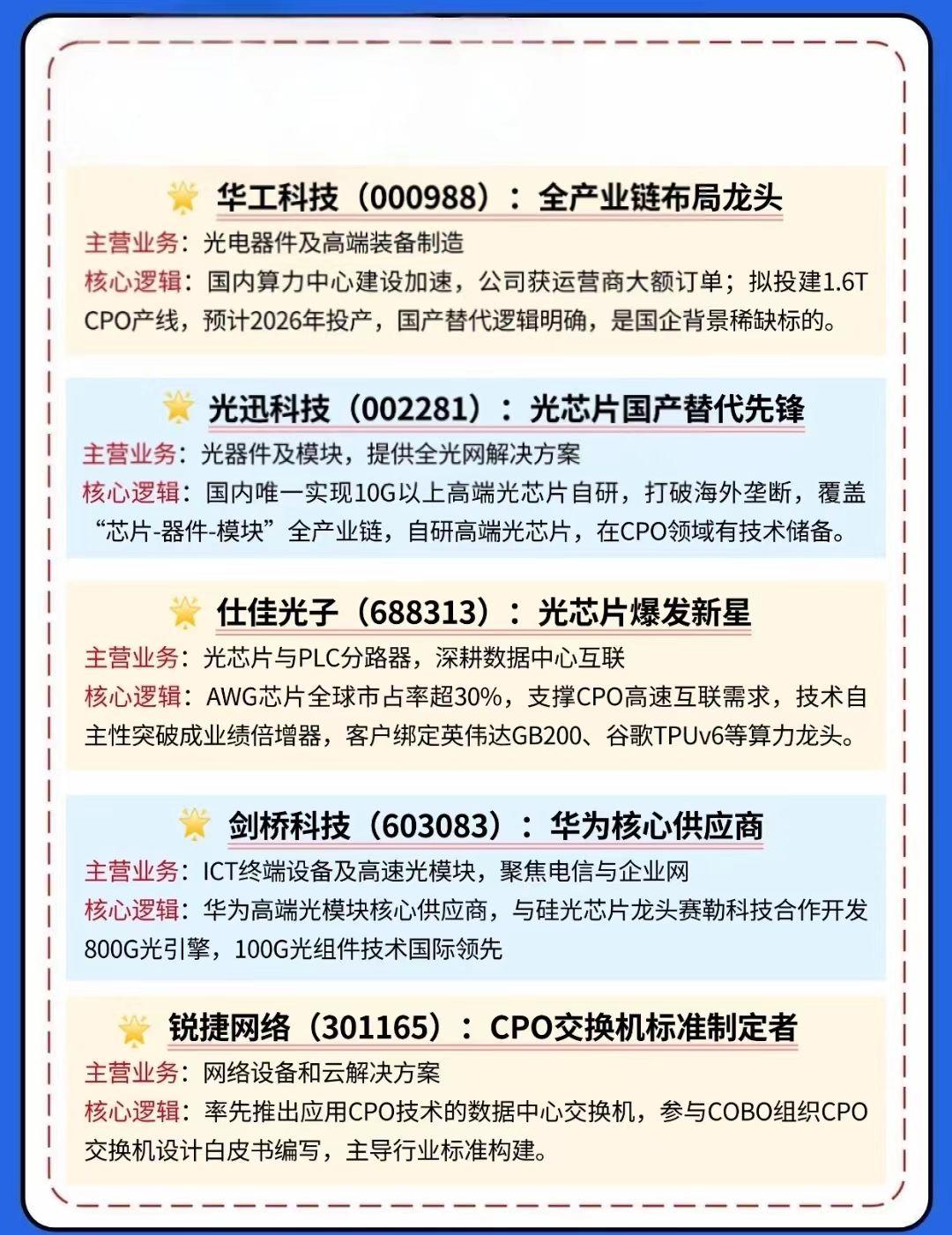 光芯片领域迎来里程碑式突破!上海交大研发的全光大模型语义生成芯片LightGen,实现了光计算技术在AI大模型应用中的关键飞跃,也让光芯片商业化预期从中远期概念转向中短期落地。相关概念十大龙头企业有哪些? AI算力需求引爆CPO与光芯片赛道,技术突破、订单爆发叠加政策支持,让相关板块迎来发展新机遇。从中际旭创、新易盛等CPO八大龙头,到中际旭创、仕佳光子等光芯片十大核心企业,每家公司都凭借独特的技术优势和业务布局,在产业链中占据关键位置。 理财有风险入市需谨慎!资料取材网络仅供参考不能作为投资依据。ai芯片概念股 光芯片概念股 光芯片产业