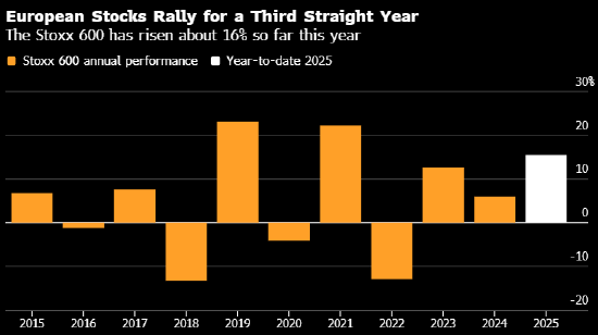 欧洲股市有望连续第三年上涨。基准斯托克欧洲600指数也有望创下近两年来最强劲的季度表现之一,市场对全球经济增长和融资成本下降的乐观情绪仍在延续。