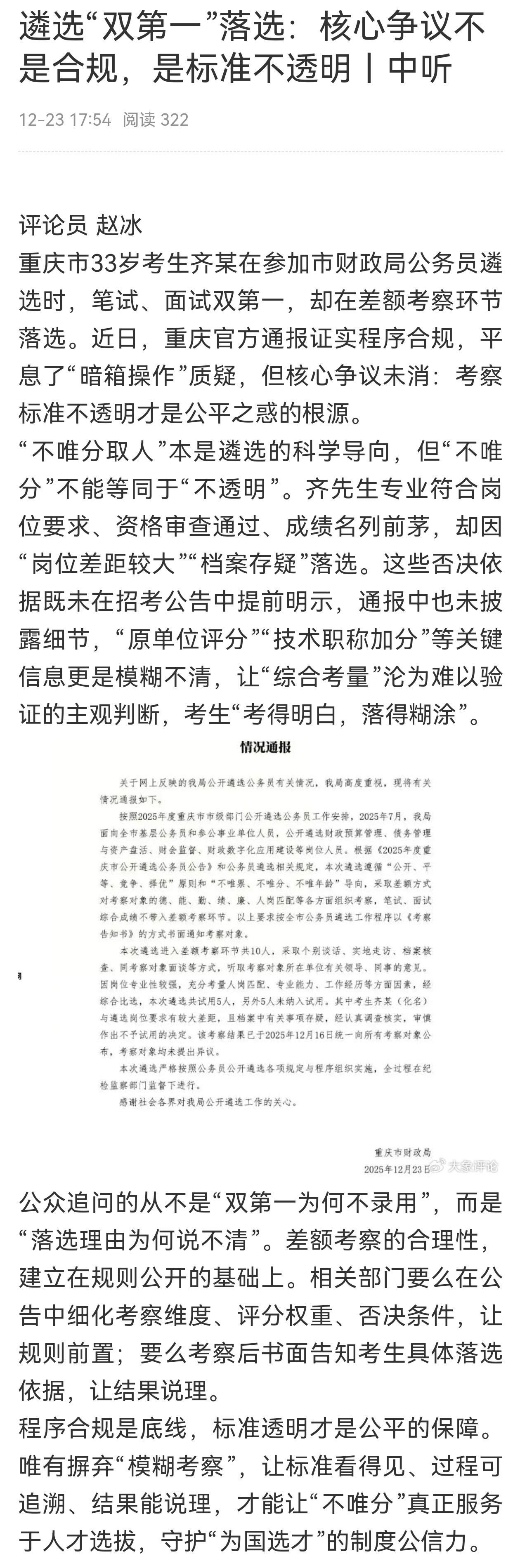 12月16日,2025年度重庆市财政局公务员遴选考试公示名单出炉,重庆33岁硕士学历的考生齐先生,笔试81.5分、面试77.4分,综合79.45分,均列“综合管理2”岗位第一名,却在差额考察环节被刷,最终未能进入拟试用名单,综合成绩第2、第3的考生反而成功上岸。男子遴选双第一因原单位未打满分落选报考单位回应双第一男子落选12月23日,重庆市财政局发布通报,给出的理由是:人岗匹配度不足,齐某的业务能力与报考岗位不匹配,且不具备相关技术职称加分,以及其档案中有关事项存疑,出于审慎原则作出不予试用决定,具体疑点却未对外披露。个人质疑的是,报考单位既然实行“差额考察”的遴选规则,为何没有提前说明?齐某在报名阶段的资格审查都通过了,才进行的笔试、面试,且取得双第一的成绩,居然被刷下来,如果笔试面试分数仅是入场券,而非最终录用的要求,那存在的意义是什么?重庆市财政局给出的理由,不管是人岗匹配度不足,还是个人档案存疑,都是报考单位在资格审查阶段应该重视的,而非事后的“亡羊补牢”。更离谱的是,齐某家属在网上反映情况后,相关帖子被要求删除,再次暴露了报考单位对于其“考核标准不透明”的心虚。“差额考察”环节不能成为“黑箱考察”,公务员遴选类似于“内部选调”,允许用人单位结合岗位特点对候选人专业背景、工作实绩、群众口碑等进行主观判断,面试、笔试成绩却成了参考项。重庆市财政局工作人员称,在考察测评环节“齐某的领导和同事没有给满分,而其他5名拟录用人员都拿到了满分”,那么打分的标准是什么?满分的具体定义又是什么?男子遴选双第一因原单位未打满分落选
