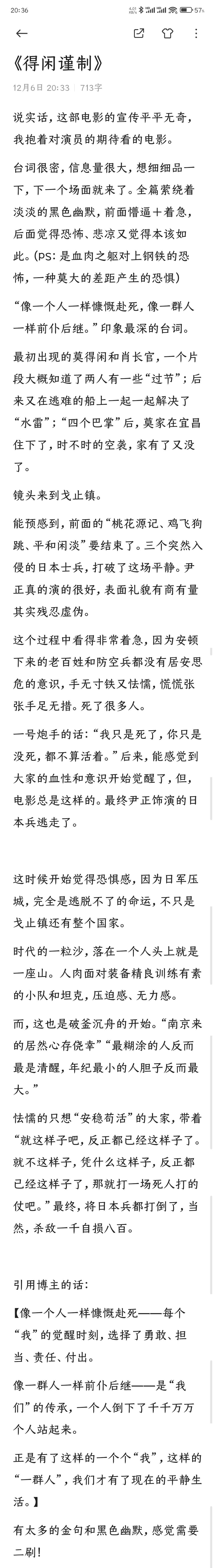 得闲谨制(2025) 我的评分:这里是影评!剧透预警⚠️台词很密,信息量很大,想细细品一下,下一个场面就来了。全篇萦绕着淡淡的黑色幽默。“像一个人一样慷慨赴死,像一群人一样前仆后继。”印象最深的一句台词。时代的一粒沙,落在一个人头上就是一座山。:“南京来的居然心存侥幸”“最糊涂的人反而最是清醒,年纪最小的人胆子反而最大。”“就这样子吧,反正都已经这样子了。就不这样子,凭什么这样子,反正都已经这样子了,那就打一场死人打的仗吧。”“历史本就是人民拿血和着 写在泥巴里的。”怯懦的兵,无知的孩子,冒失的女人,老作死但不死的老头,颠三倒四的工匠,和笨的连刀都拿不稳的死老百姓。也是架起炮的钢铁,有无限未来的希望,勇决的新妇女,宁死不做猪狗的风骨,敢为人先拼出生命的谨制之人。和无数个用血和泥写就历史的“人民”。看的时候悲伤气愤,恨铁不成钢,一点也不“爽”。可最后筑铁成钢,能让我坐在影院里安安心心看电影的,也正是历史上这些无数的“钝铁”。不论是演员还是剧本、画面,都给人一种不轰轰烈烈,但余震长绕心尖的感觉。出电影院的一瞬,我看着热闹繁华的景象,忽然明白了电影里太爷说的那句话。“看哪里都眼熟,看哪里都眼生。”