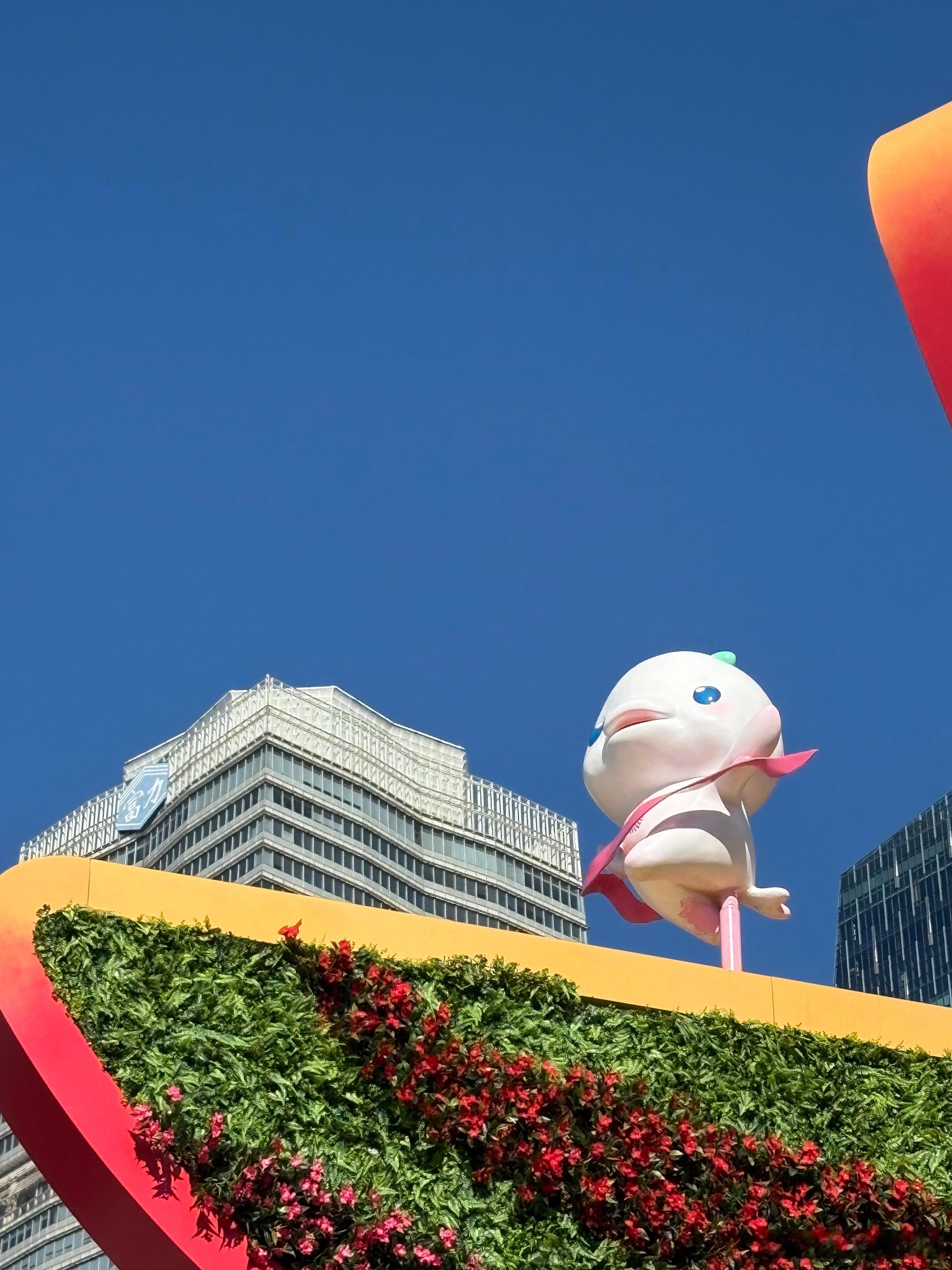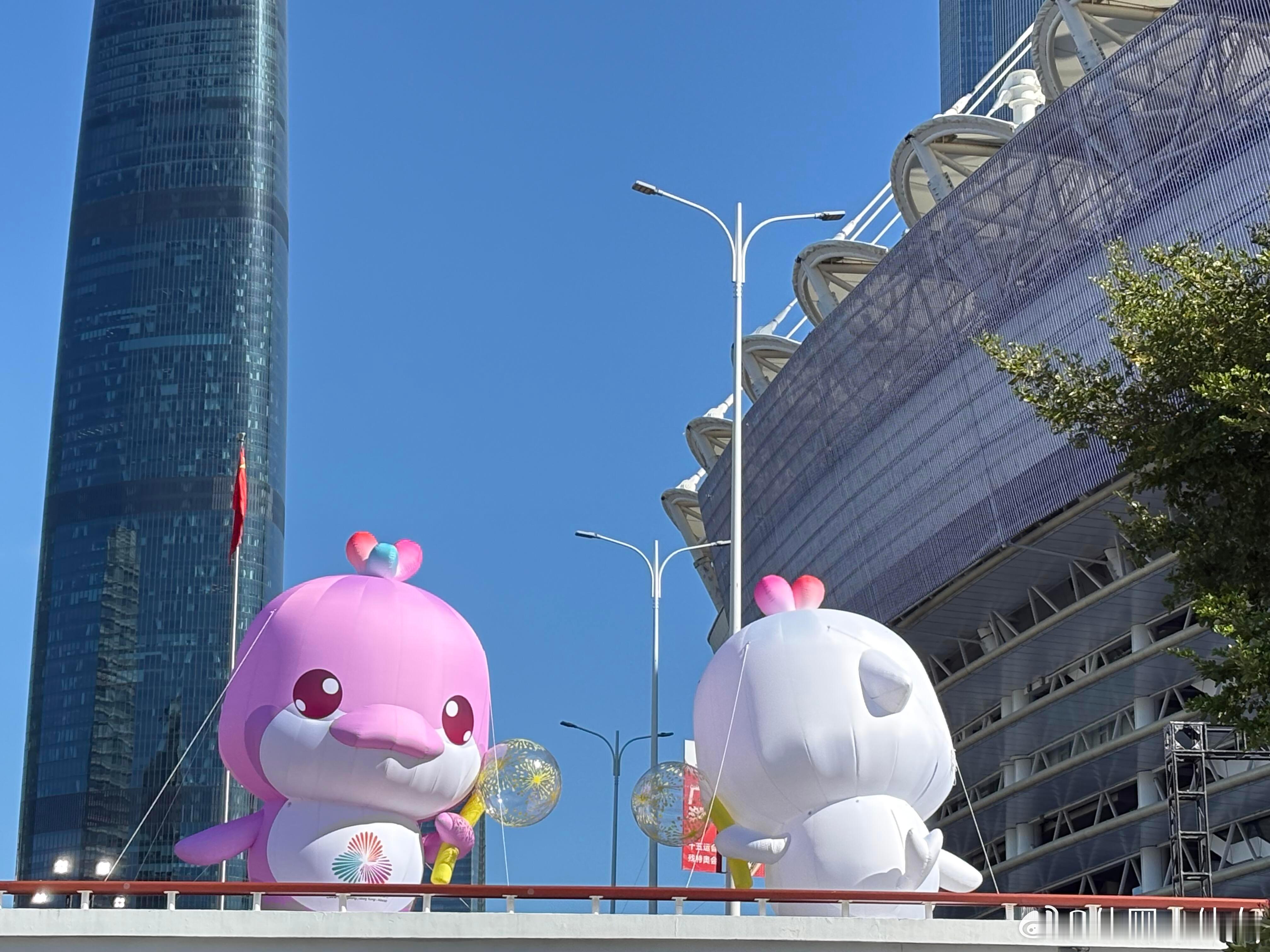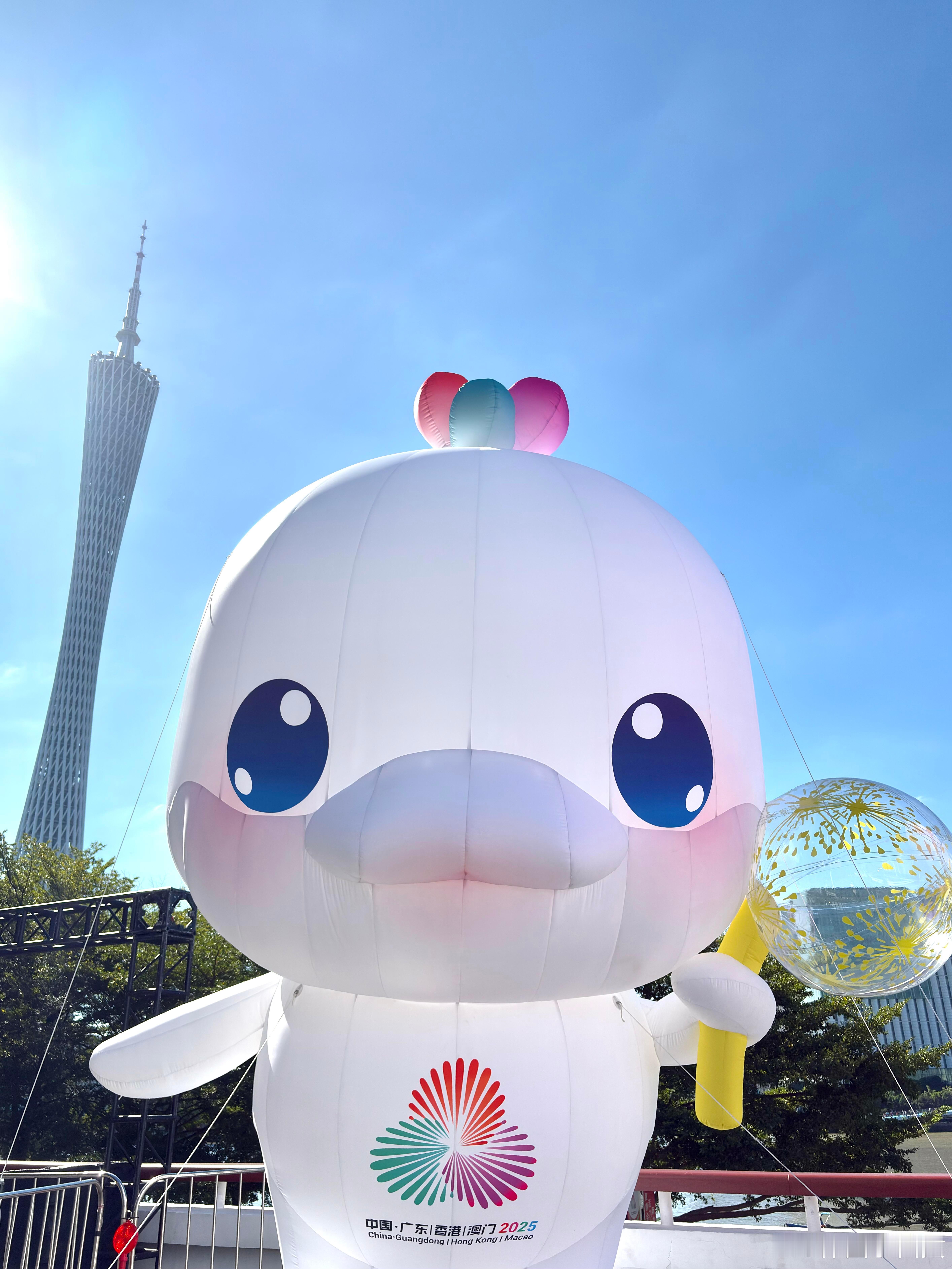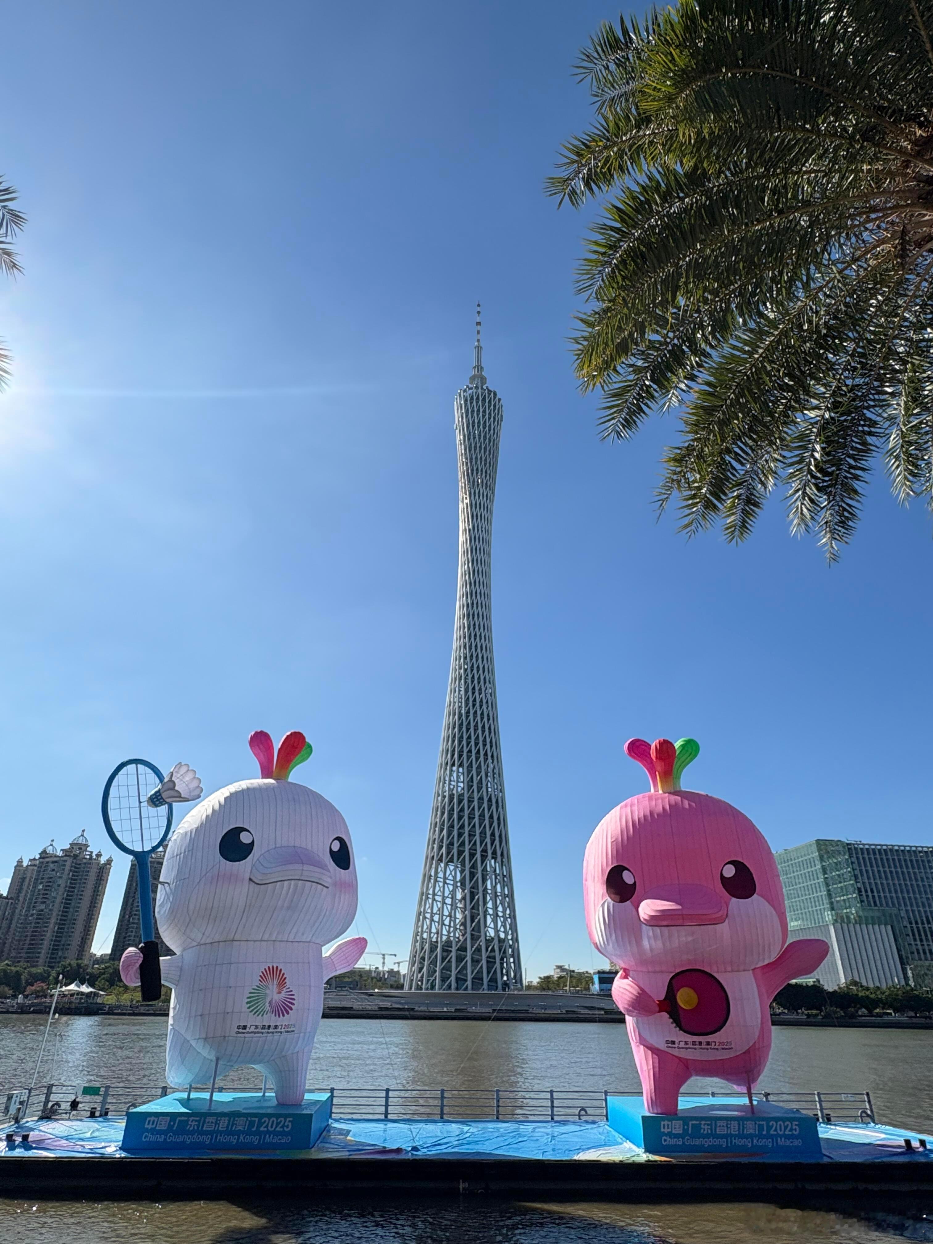 晒出我的年度兴趣好好出门的一年 全运会期间专程去花城广场打卡,半天时间被满溢的运动活力和城市美感狠狠戳中!广州塔下的十五运会吉祥物“喜洋洋”“乐融融”绝对是全场焦点,这对以中华白海豚为原型的小家伙被网友亲切喊作“大湾鸡”,一白一粉的巨型充气造型憨态可掬,头顶的三色水花设计还藏着粤港澳三地融合的巧思,细节感拉满。跟着全运游广东 它们或是手持羽毛球拍摆出竞技姿态,或是化身举重小将展现力量感,不同运动造型与广州塔、ICC西塔、IFC等城市地标同框,现代都市的摩登与全运赛事的热情碰撞出别样火花。蓝天作幕,椰林为衬,江风拂过的时候,看着吉祥物萌萌的模样,连空气里都飘着欢快的气息。还遇到不少游客和市民围着吉祥物拍照打卡!小朋友们对着“大湾鸡”欢呼雀跃,这份对赛事的期待和对城市的热爱,让花城广场的氛围感直接拉满。走在广场上,既能感受广州作为东道主的满满诚意,也能体会到大湾区携手办赛的凝聚力,这趟打卡之旅,不仅收获了趣味满满的城市记忆,更真切触摸到了全运盛会的热烈脉搏!🏅