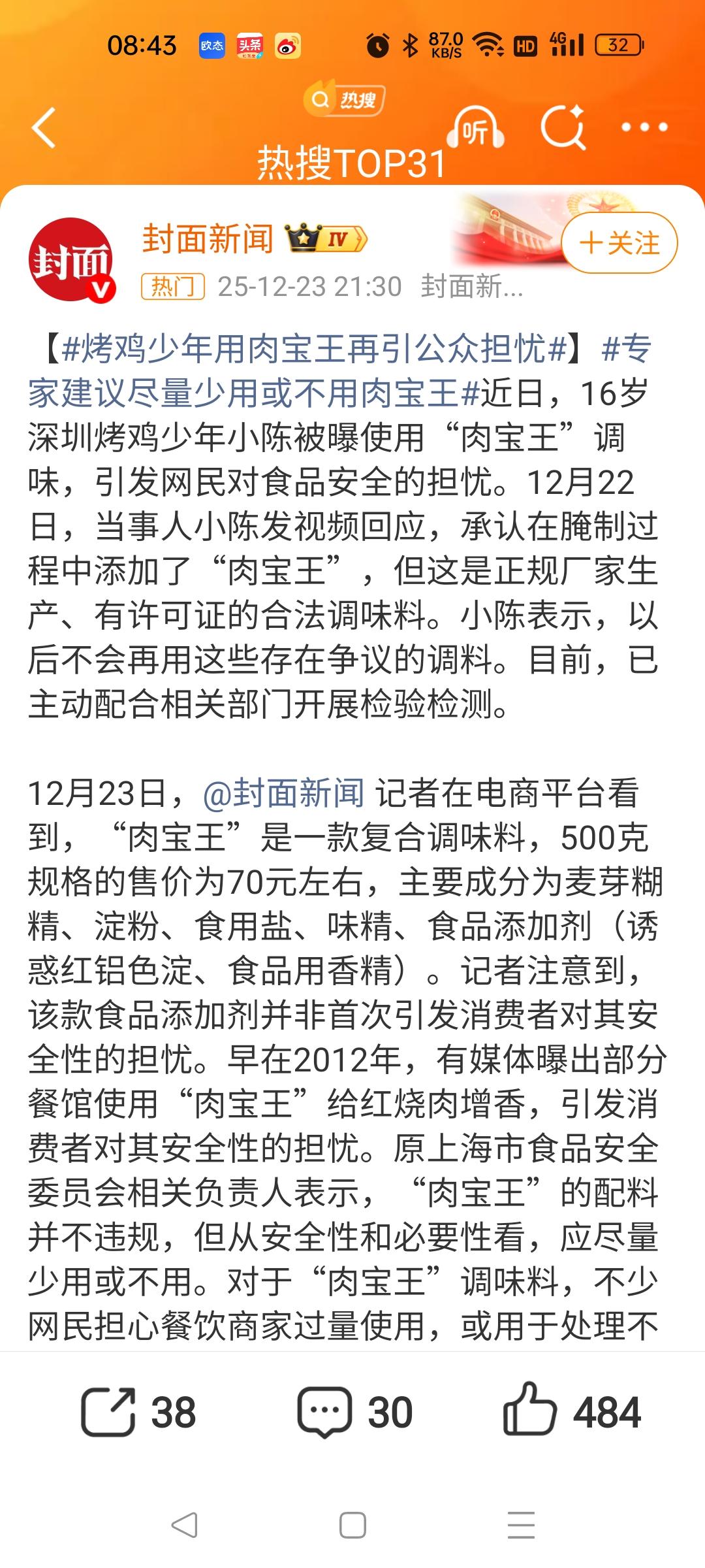 家人们,当你满心欢喜地咬下一口烤鸡,却得知这美味背后可能藏着“肉宝王”,你还能吃得安心吗?近日,16岁深圳烤鸡少年小陈使用“肉宝王”调味一事,如一颗巨石投入舆论的湖面,激起千层浪,引发了公众对食品安全的深深担忧。 12月22日,小陈发视频回应,承认腌制时添加了“肉宝王”,还强调这是正规厂家生产、有许可证的合法调味料。可即便如此,大家的担忧并未消散。毕竟,“肉宝王”这类强力调味料,其安全性一直存在争议。很多人觉得,食物本应靠天然食材和传统调料来呈现美味,过度依赖这类“科技与狠活”,总让人心里不踏实。 从这件事我们能看到,在追求美食的便捷与高效时,我们似乎在不知不觉中偏离了食品安全的轨道。商家为了吸引顾客、提升口感,不惜使用有争议的调味料;而消费者在享受美食的同时,却可能忽略了潜在的健康风险。这背后,反映出的是整个社会对食品安全认知的不足和监管的漏洞。 好在小陈表示以后不会再用这些存在争议的调料,还主动配合相关部门检测,这是一个积极的态度。但我们更希望看到的是,整个食品行业都能重视起来,坚守食品安全的红线。 对于“肉宝王”这类调味料,你觉得应该完全禁止,还是可以在合理范围内使用呢?快来评论区说说你的看法社会百态 社会新闻 !