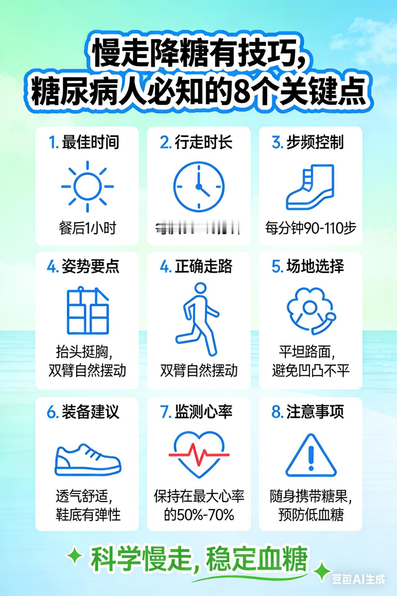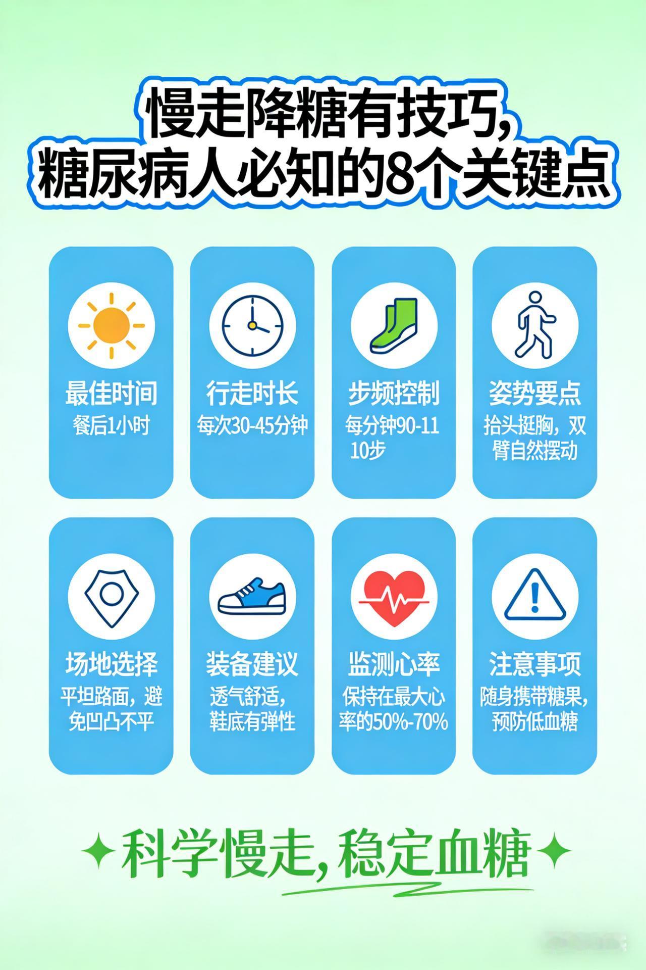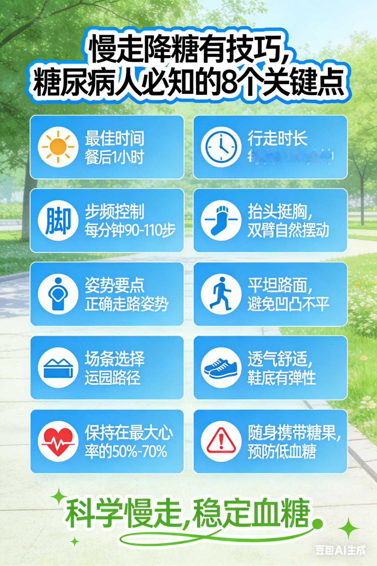 慢走降糖有技巧,糖尿病人必知的 8 个关键点 每天慢走六千步错了?医生揭秘:糖尿病人群,慢走做好这8点收获惊人! 你是不是也一直以为,糖尿病人每天慢悠悠走个六千步,就能把血糖稳稳“拿捏”?其实,这里面门道可多了!慢走好处超乎想象,但想让效果拉满,得做好下面这8点,一起揭开慢走的神奇面纱! 精准控糖“小能手” 选对饭后半小时到一小时的黄金时段开启慢走,就像给肠胃安排了一场舒缓的SPA。它能温柔地促进肠胃蠕动,让食物消化更顺畅,避免食物在体内堆积“捣乱”,导致血糖像坐过山车一样骤升,让血糖始终在平稳的轨道上运行。 温和燃脂“魔法师” 控制好每分钟90 - 120步的匀速节奏,慢走瞬间化身温和的能量消耗魔法师。它如同小火慢炖,持续稳定地将身体里多余的糖分转化为能量,既不会让你累得气喘吁吁,又能悄悄地把血糖“拉回”安全线,轻松实现控糖目标。 天然氧吧“活力源” 在公园、河边等空气清新的地方慢走,仿佛一头扎进了天然氧吧。每一次呼吸都像是在给身体注入满满的活力,让心肺功能越来越强,免疫力也像小卫士一样守护着身体,让你更有底气和糖尿病这个“小怪兽”战斗。 双脚保护“小铠甲” 穿上舒适合脚的运动鞋慢走,就像是给双脚披上了一层坚固的保护铠甲。它能减轻脚部承受的压力,预防那些恼人的足部损伤,让你的双脚在慢走过程中舒舒服服、安安全全。 身体启动“预热键”&放松“保养术” 做好热身拉伸,慢走前是给身体按下启动预热键,让关节灵活得像灵动的小精灵,肌肉兴奋得像充满能量的小马达;慢走后则是给身体做一次放松保养,减少酸痛感,延长身体的“使用寿命”,让你时刻保持最佳状态。 血糖监测“导航仪” 监测血糖配合慢走,就像给身体装上了一个精准的导航仪。它能让你清楚了解自己的身体状况,根据血糖的变化灵活调整运动计划,让慢走更有针对性,控糖之路更加顺畅。 同行伙伴“动力源” 结伴慢走,就像在黑暗中找到了并肩前行的伙伴。大家互相监督、互相鼓励,遇到突发状况也能互相照应,让慢走不再孤单,充满动力,更容易坚持下去。 糖尿病人只要做好这8点,慢走就能成为你控糖路上的超级英雄,让你的生活重新焕发出健康光彩!还等什么,赶紧行动起来吧!
