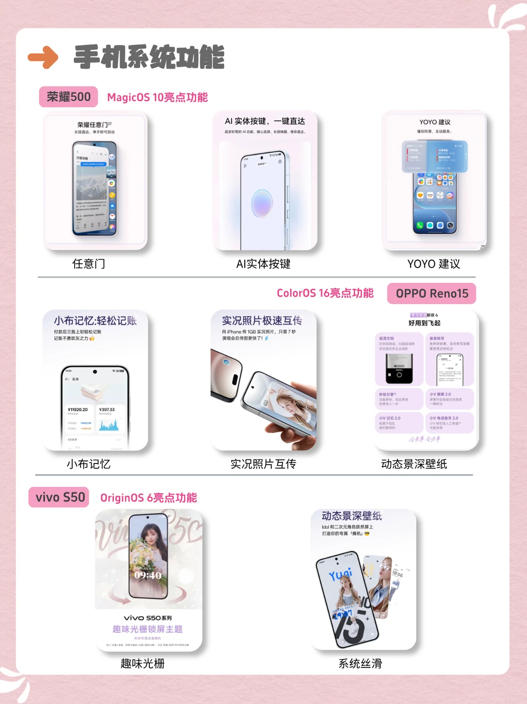 OPPO Reno15的ColorOS 16系统超丝滑,动态景深壁纸沉浸感拉满,还有AI闪记功能[自拍R],AI实景对话,也很实用; vivo和荣耀的系统也很不错,整体用着也很流畅