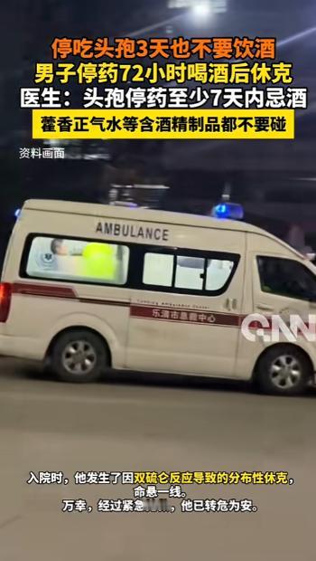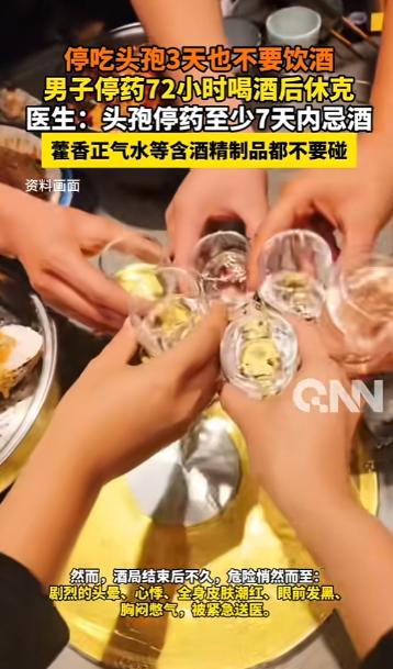 “悲剧还是发生了!”近日,湖南长沙,一男子在头孢停药后,严格计算时间,以为过了72小时药物就已经代谢干净,于是在一次晚宴上喝了白酒,不料酒局刚结束,男子就突发休克,差点心脏骤停,有生命危险。网友:不拿健康当回事! 这事听着就让人揪心,其实就是个很常见的情况,谁还没个感冒发烧需要吃药的时候。 听说这位大哥是因为呼吸道感染,去医院输了几天头孢,等症状好转停药后,正好赶上一场推不掉的朋友饭局。 他也不是不知道头孢配酒危险,要是还在吃药期间,肯定直接拒绝了。 关键是他心里有个“小算盘”,总听人说停药满72小时就能喝酒,还特意记了最后一次输液的时间,精确到小时数,反复核对确认过了72小时才敢去赴局。 饭桌上朋友递过来白酒,他也没犹豫,直接就喝了,大概喝了三两的样子,全程都没啥不舒服的,脑子清醒,跟朋友聊得也挺开心。 这一下更让他觉得,自己算的时间准没错,体内的药肯定已经代谢完了。 可谁能想到,危险就藏在后面,酒局一结束,大家起身准备走的时候,意外突然就来了。 这位大哥刚站起来,就觉得天旋地转,脸瞬间变得惨白,浑身还冒出一股热意,喘不上气。 旁边的朋友还没反应过来,他就直挺挺地倒在了地上。据说当时他眼前一片黑,头疼得像要炸开,慢慢就没了意识,朋友们吓得不行,赶紧打了120,守在旁边简单做了点急救措施。 送到医院急诊的时候,情况已经很危急了,血压低到临界值,心率也特别微弱,医生一看就知道是典型的双硫仑样反应,就是头孢和酒精在体内起了反应导致的急性中毒。 这种情况真的很凶险,稍微耽误点时间,就可能引发心律失常,甚至心脏骤停。 医护人员赶紧展开抢救,忙了好几个小时,才算把他从鬼门关拉了回来,各项指标慢慢稳定下来。 医生后来也说,再晚送几分钟,后果真的不堪设想。说到底,就是他太相信“72小时”这个死规矩了。 其实咱们的身体根本不是机器,哪有那么绝对的“安全时间”,每个人的年龄不一样,肝肾功能强弱不同,就算是同一个人,不同体质状态下,药物代谢速度也不一样。 这位大哥就是因为体内的头孢没完全代谢掉,一喝酒就出了大事。 可能很多人都以为停药3天就能喝酒,这真是个大误区,医学界其实一直建议,头孢停药后至少要等7天才能碰酒精。 而且这7天里,不光是白酒、啤酒这些酒,就连酒心巧克力、藿香正气水这种含酒精的东西,都可能引发反应。 更关键的是,目前这种反应还没有特效药,全靠医生对症抢救。 经过这一遭,这位大哥肯定也彻底明白了,健康这事儿真不能赌。 别觉得自己算得准,就抱着侥幸心理去试探医学底线,这根本就是拿自己的命开玩笑,谁也输不起。 大家对此怎么看?欢迎评论区留下您的观点!