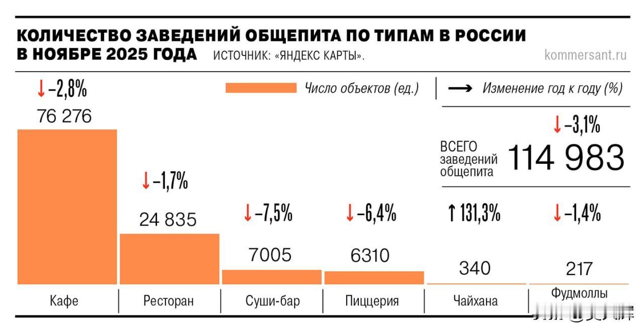 俄罗斯餐饮门店数量持续缩减 “Yandex地图”统计数据显示,过去一年间,俄