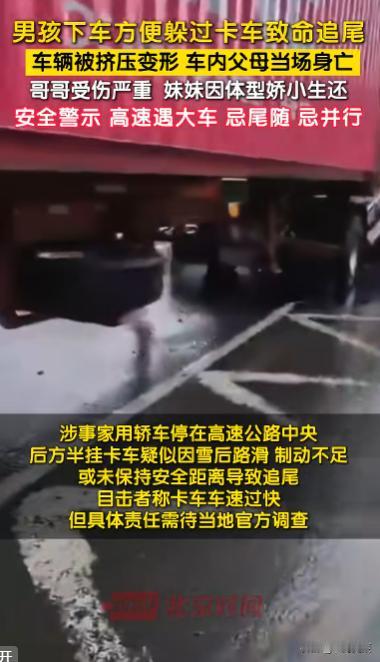 “这就是命啊!”哥伦比亚一家4口出去玩,中途儿子内急下车如厕,母亲拍视频时还开玩笑说:"拜拜,胡里奥",结果,背后一辆疑似刹车失灵的半挂卡车,直接撞向他们的轿车,父母当场死亡,男孩不在车内幸免于难,他年幼的妹妹因体型较小,被安全装置缓冲,奇迹生还! 一家人趁着空闲出门游玩,开车走在半路的时候,遇上了堵车。本来堵车就挺耽误时间的,偏偏这时候,家里的儿子胡里奥突然说想上厕所。爸妈看着前面长长的车队,估计一时半会儿也走不了,就想着让孩子先下车在路边解决,总比憋在车里舒服。 儿子下车后,妈妈觉得这场景还挺有意思,就拿起手机拍视频,想记录一下。看着儿子走向路边的背影,她还笑着跟镜头开玩笑,跟儿子说了句“拜拜,胡里奥”。那语气里全是一家人出游的轻松,谁都没把这当成一回事,更没人想到,这句随口的玩笑,竟然成了最后的告别。 就在妈妈话音刚落没多久,谁都没预料到的厄运突然降临了。只听见身后传来一阵刺耳到让人牙酸的刹车声,那是橡胶在路面上拼命摩擦的声音,听得人头皮发麻。紧接着,“轰隆”一声巨响,整个世界都仿佛安静了一瞬,之后就是混乱的碰撞声。 原来是一辆重型半挂卡车,不知道是不是因为刹车失灵,直直地朝着他们停靠在路边的家用轿车撞了过来。更倒霉的是,他们的车前面刚好也停着一辆大货车,这下直接被两辆大车前后夹击。家用轿车在重型卡车面前,就像个脆弱的易拉罐,瞬间被挤压成了一堆扭曲的废铁。 坐在车里的父母,连反应的时间都没有,更别说逃生了,当场就没了性命。而正在路边的胡里奥,因为不在车里,毫发无伤。可他亲眼目睹了这一切,看着自己的爸妈瞬间消失在变形的车厢里,那种恐惧和绝望,恐怕一辈子都忘不了。 救援人员很快就赶到了现场,在清理那堆严重变形的金属废墟时,又发现了一个让人不敢相信的奇迹。胡里奥年幼的妹妹当时也在车里,按理说在这么大的冲击力下,很难有生还的可能。但偏偏因为她年纪小、体型小,再加上车内安全装置的意外缓冲,竟然被卡在了一个没被完全压溃的小角落里。 妹妹虽然身上受了伤,被紧急送去医院救治观察,但好歹保住了性命。本来可能是一家四口全部遇难的惨剧,最后留下了胡里奥和妹妹这两根独苗。不少人看完都忍不住唏嘘,这真的是命运的捉弄,差一点就是截然不同的结局。 后来大家才知道,肇事的半挂卡车疑似刹车失灵,至于具体是因为雪后路面湿滑影响了制动,还是司机疲劳驾驶、车辆超载或者维护不到位,还在进一步调查。但不管原因是什么,这场车祸带来的悲剧已经无法挽回了。 那段妈妈拍的最后视频被传到网上后,好多网友都看哭了。有人说,妈妈拍视频的时候,眼里全是笑意,语气那么轻松,谁能想到一转眼就是永别。那句“拜拜”,本来是玩笑,却成了再也无法回应的告别,想想就让人揪心。 更多的人在感慨“这就是命啊!”。如果不是遇上堵车,如果不是胡里奥刚好内急下车,恐怕这两个孩子也难逃厄运。可偏偏就是这么一个偶然的小插曲,让胡里奥捡回了一条命。而妹妹能在那么惨烈的撞击中幸存,更是奇迹中的奇迹。 这起惨剧也给所有开车的人提了个醒,在路上真的半点都不能掉以轻心。尤其是在路边停靠或者遇到堵车的时候,一定要远离大货车,千万别让自己变成两辆大车中间的“夹心饼干”。就算没办法避开,停在大车后面的时候,也可以学着把方向盘往左打一圈,万一真的被追尾,说不定还能给自己留一线生机。 胡里奥和妹妹是不幸的,小小年纪就失去了父母,以后的路只能自己走。但他们又是幸运的,在这么毁灭性的灾难中活了下来。这也让我们明白,意外从来不会提前打招呼,我们永远不知道哪一次再见就会变成永别。平时开车的时候,一定要多注意安全,离危险远一点,再远一点,这不仅是对自己负责,也是对家人负责。 信息来源 :北京时间
