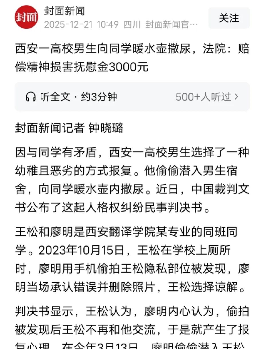 “天生的坏种”陕西西安,一男生趁同学上厕所时,偷偷拍下同学隐私部位,同学发现后,要求男生道歉,并删除照片,男生迫不得已乖乖照做,谁料,事后男生觉得同学开始疏远他,因此怀恨在心,一年多后,偷偷潜入同学宿舍往他的保温壶里撒尿,导致同学误喝,同学气愤不已,起诉到法院,结局令人意外。 那天王松(化名)在厕所里,一转身突然发现廖明拿着镜头对着自己的隐私部位。王松当场就火了,抓住廖明让他删了照片,廖明没办法,只能删了,还口头道了歉。但明眼人都能看出来,他这道歉根本不是真心的,更像是被逼无奈的应付。 在廖明眼里,自己删了照片、说了对不起,这事儿就该翻篇了。他觉得自己这是“宽宏大量”,王松就该顺着台阶下,继续跟他像以前一样相处。可换谁遇到这种偷拍隐私的事,心里都会有阴影吧?王松之后就刻意疏远廖明,不怎么跟他说话,日常也尽量避开。 按理说廖明这时候该反思自己的问题,是自己先越界伤害了别人。可他偏不,反而觉得王松“太计较”“太小气”“记仇”,心里慢慢就攒下了怨气。这种“我都道歉了,你还不原谅就是你的错”的扭曲心态,一憋就是一年多,直到今年3月刚开学的时候,彻底爆发了。 那天廖明瞅着王松的宿舍没人,就偷偷溜了进去,干出了一件特别恶心的事,往王松日常用的暖水壶里撒了尿。他这哪儿是同学间的报复,分明是把自己的怨气,变成了践踏别人尊严的利器。 对于王松来说,这绝对是生理和心理的双重打击。那天他从外面回来,又累又渴,想都没想就拿起暖水壶倒了一大口喝下去。结果刚咽下去一点,一股刺鼻的尿骚味就涌满了口腔,他当场就冲进卫生间疯狂呕吐,胃里翻江倒海,好半天都缓不过来。 后来王松越想越不对劲,就去医院做了检测,报告明确证实了暖水壶里的液体是尿液。他又调了宿舍周边的监控,画面清清楚楚拍到廖明偷偷进出自己宿舍的身影。报警之后,廖明在警方面前也没否认,写下了保证书和道歉信,承认是自己干的。可就算这样,那一口下肚的恶心感,还有被人恶意羞辱的委屈,怎么也抹不掉。 这事儿之后,王松特别愤怒,一开始向廖明索赔四万多块钱。在他看来,这钱不仅是弥补自己的身体不适,更多是为了被践踏的人格尊严讨个说法。但法院的判决却很冷静,没有完全支持他的诉求。 法院说,现有证据很难百分百证明王松“确实喝下了尿液”这个关键环节,所以驳回了他基于“误喝尿液”提出的大额赔偿。但这并不代表廖明没做错事,更不代表他不用担责。往别人日常使用的暖水壶里投尿,这种行为本身就是对他人人格尊严的极端羞辱,已经触碰了法律的红线。 最后法院判决,廖明要赔偿王松的医疗费和交通费,一共1206.64元,另外还要支付3000元的精神抚慰金,加起来就是4206.64元。除了这个民事赔偿,廖明还被派出所罚了500块钱,学校也给了他记过处分。这就是他为自己所谓的“玩笑式报复”,付出的全部代价。 可能有人觉得,几千块钱的赔偿,根本弥补不了王松受到的伤害。但这个判决的意义,其实不在于钱的多少,而在于明确了一个道理:任何借口都不能成为侵权的挡箭牌,哪怕你说自己是“闹着玩”,只要伤害了别人、践踏了别人的尊严,就必须承担法律责任。咱们常说的《民法典》里关于人格权的规定,不是摆着看的,只要越界了,就会被追责。 这事儿最让人后背发凉的,其实不是赔偿金额,而是廖明那种失控的心态。从一开始的偷拍隐私,到被疏远后的怀恨在心,再到后来的恶意投尿,他全程都没意识到自己错在哪里。他不懂得尊重别人的隐私,不懂得为自己的错误负责,更不明白信任一旦碎了,就再也拼不回来了。 把羞辱别人当成发泄怨气、找回心理平衡的方式,这种人早就站到了公序良俗的对立面。这事儿不光是给在校的学生提了个醒,也给所有成年人敲了警钟:千万别拿“开玩笑”当借口,去做伤害别人的事。 成年人的世界里,每一次对别人的冒犯,每一次对底线的践踏,最后都会有相应的代价。这个代价可能是金钱,可能是名声,也可能是自己的前途。廖明的记过处分,会跟着他的学籍档案,以后不管是升学还是找工作,都可能受影响;那笔赔偿款,更是实实在在的教训。 同学之间也好,朋友之间也罢,相处的前提是互相尊重。别因为一点小事就记恨在心,更别用极端的方式报复别人。守住自己的底线,不做伤害别人的事,这才是立身之本。不然最后买单的,只会是自己的前途和脸面。