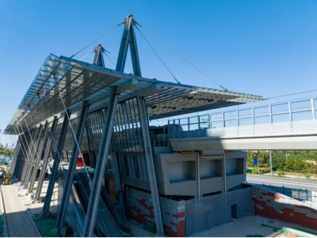 公路技师学院站紧邻超算中心,以轻质材料创新与形态美学表达为策略,ETFE膜材料呈现丰富光影,其绚丽的色彩设计,灵感来源于当地彩石街道流传的“女娲炼五彩石补天”的神话传说,将现代科技与传统文化完美融合。