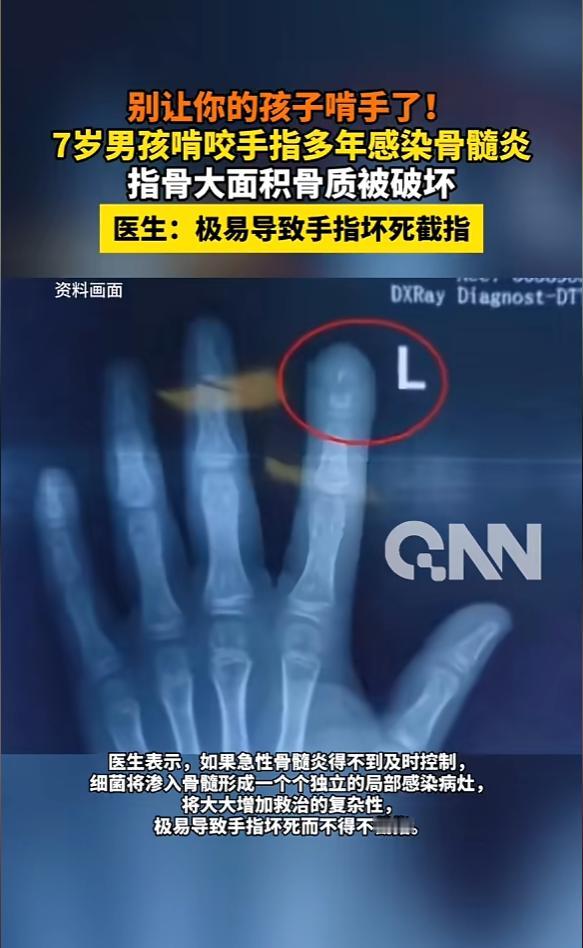 “悲剧还是发生了!”湖南,一男孩喜欢咬手指,他的妈妈尝试过各种方法都没能改掉他这个习惯,久而久之也就由着他去,结果前段时间,男孩经常啃咬的手指出现肿胀,还会渗出脓水,去医院检查后,确诊男孩得了骨髓炎,有截肢风险! 这男孩性格挺开朗,可唯独改不掉啃指甲的毛病,没事就把手指塞进嘴里啃,指甲被咬得坑坑洼洼,指尖经常带着细小的伤口。李女士一开始特别上心,知道这习惯不卫生,也怕伤了孩子的手指,就想尽办法帮他改。 一次次干预都以失败告终,李女士也渐渐没了耐心。后来孩子上了小学一年级,她发现身边不少同龄小孩都有类似的小动作,有的咬指甲,有的抠手指,也没见谁出什么大问题。心里的警惕性一降再降,她慢慢就把这根弦松了下来,心想“可能孩子大了自然就好了”,既然管不住,那就干脆由着他去。可她万万没想到,这种侥幸的放任,恰恰为后来的悲剧埋下了祸根。 直到前段时间,李女士发现孩子不对劲了。以前总是活蹦乱跳的小男孩,变得蔫蔫的,左手食指总是下意识地缩在袖子里,不管是吃饭还是写作业,都小心翼翼地护着,碰都不让别人碰一下。李女士心里犯嘀咕,硬把孩子的手拽过来一看,当场就吓懵了,心瞬间凉了半截。 那根长期被啃咬的食指,已经完全变了形,指尖肿得像个熟透的红萝卜,颜色都有点发紫发黑,看着就触目惊心。更让人揪心的是,稍微用力一按,里面浑浊的脓水就顺着破损的皮肤往外渗,孩子疼得眼泪在眼眶里打转,却强忍着不敢哭出声。 李女士吓得魂都没了,也顾不上多想,当即就带着孩子往附近的医院跑。当时医生检查后,按常规流程做了处理:把肿胀的部位切开引流,把里面的脓液彻底挤干净,又开了些口服消炎药,叮嘱李女士回家后按时给孩子换药、清洗伤口。那时候不管是医生还是李女士,虽然担心,但都觉得只要好好护理,清了创、吃了药,伤口慢慢就会好起来,没往更严重的地方想。 可现实却给了他们一记响亮的耳光。这伤口就像个无底洞,普通的换药和口服消炎药根本起不了作用。孩子每天晚上都被疼得直打滚,整夜整夜睡不着觉,哭得撕心裂肺。原本只是指尖的肿胀,慢慢扩散到了整个手指,疼痛感不仅没减轻,反而越来越强烈,孩子的精神状态也越来越差,吃不下饭,连上学都没法去了。 这时候李女士才真正意识到,事情可能远远超出了自己的认知范围,根本不是简单的皮肤感染。她再也不敢耽误,赶紧带着孩子转去了上级大医院。经过详细的影像学检查和抽血化验,结果出来的那一刻,整个家庭都如坠冰窟,孩子得的不是普通的炎症,而是骨髓炎! 医生解释说,孩子长期啃咬手指,指尖的皮肤反复破损,指甲缝里的细菌就顺着这些细微的破口钻了进去。一开始只是感染了表面的软组织,但因为没有及时控制住,细菌一路“杀”进了指骨和骨髓里,形成了深层次的感染。这就像一栋房子,外墙看着只是有点破损,可里面的承重柱已经被白蚁蛀空了,情况非常棘手。 更让人揪心的是,手指属于血液循环比较差的末梢部位,普通的口服消炎药很难通过血液足量输送到病灶处,这也是之前的治疗完全失效的原因。医生严肃地告诉李女士,如果这种骨头上的感染再控制不住,细菌继续侵蚀指骨,唯一的办法就是把这根手指截掉,否则感染扩散到全身,后果会更严重。 听到“截肢”这两个字,李女士的眼泪瞬间就止不住了,当场就在医院走廊里崩溃大哭。她怎么也想不通,自己当初没放在心上的一个小习惯,怎么就把孩子逼到了要锯掉手指的地步?满心的悔恨涌上心头,要是自己当初没有放任,要是能早点重视起来,孩子也不至于遭这么大的罪。 万幸的是,这次转院还算及时,没有拖到不可挽回的最后一刻。医院的医疗团队连夜制定了紧急治疗方案,通过静脉输注强力抗生素,配合多次清创手术,全力开展“手指保卫战”。目前来看,孩子的手指大概率能保住,但接下来还要面临漫长而痛苦的清创换药过程,以及长期的观察治疗,这对一个才7岁的孩子来说,无疑是一场巨大的身心磨难。 这起真实的病例,给所有心大的家长都敲响了警钟。很多时候我们以为的“小毛病”,其实是免疫系统在默默替我们负重前行,一旦细菌突破了防线,后果可能就是毁灭性的。孩子咬手指看似小事,可指甲缝里藏着葡萄球菌等各种致病菌,这些“污垢”通过破损的皮肤进入人体,尤其是手指这种精密的部位,破坏力远超想象。 而且家长们还要注意,孩子咬手指的习惯,往往不只是单纯的“坏习惯”,可能还是他们缓解焦虑、紧张的一种方式。简单粗暴地用辣椒水、苦味剂干预,或者像李女士这样后期放任自流,都解决不了根本问题。更重要的是关注孩子的心理状态,耐心引导纠正。 信源:《别让你的孩子啃手了!7岁男孩啃咬手指多年感染骨髓炎指骨大面积骨质被破坏》——青岛新闻网