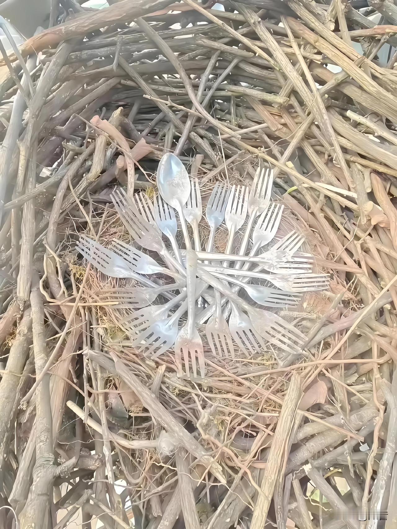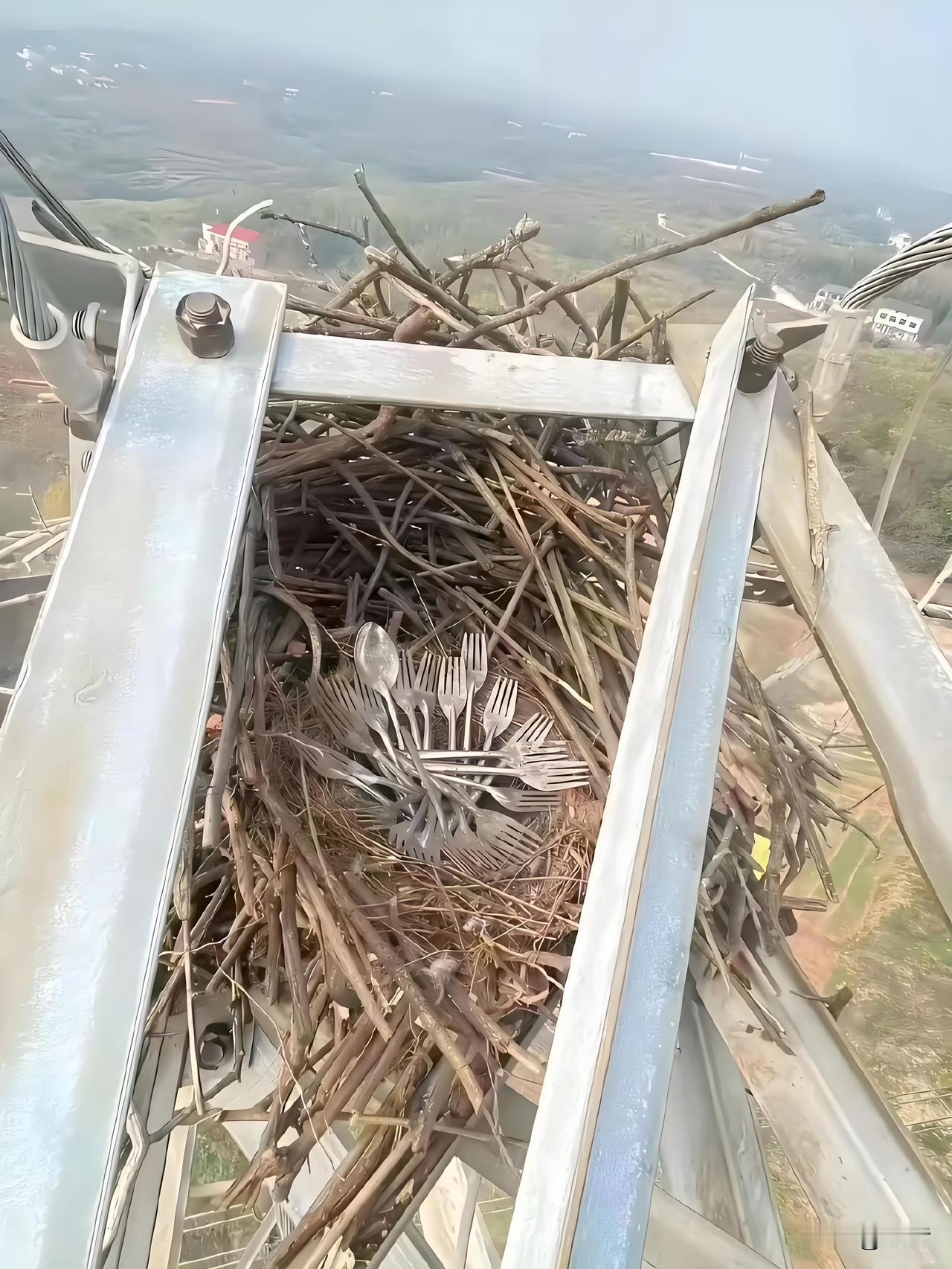 电力巡线工人拍的一组经典的鸟巢! 鸟巢搭建的特别有吸引力,四周围都是用小树枝一根一根搭建而成,看着非常的美观又更加的牢固。 估计一般的风吹不散巢穴,有一点我想了半天也没弄明白,巢穴中间的位置,全部是人类用的勺子和叉子。 其中这些勺子和叉子对鸟类能起到什么样的作用呢!这巢穴感觉很另类,不像是普通鸟类的巢穴。 请火眼金睛的友友们看看,这是什么鸟类的巢穴呢!其中巢穴内部的勺子和叉子有什么作用呢!欢迎各位友友留言讨论!