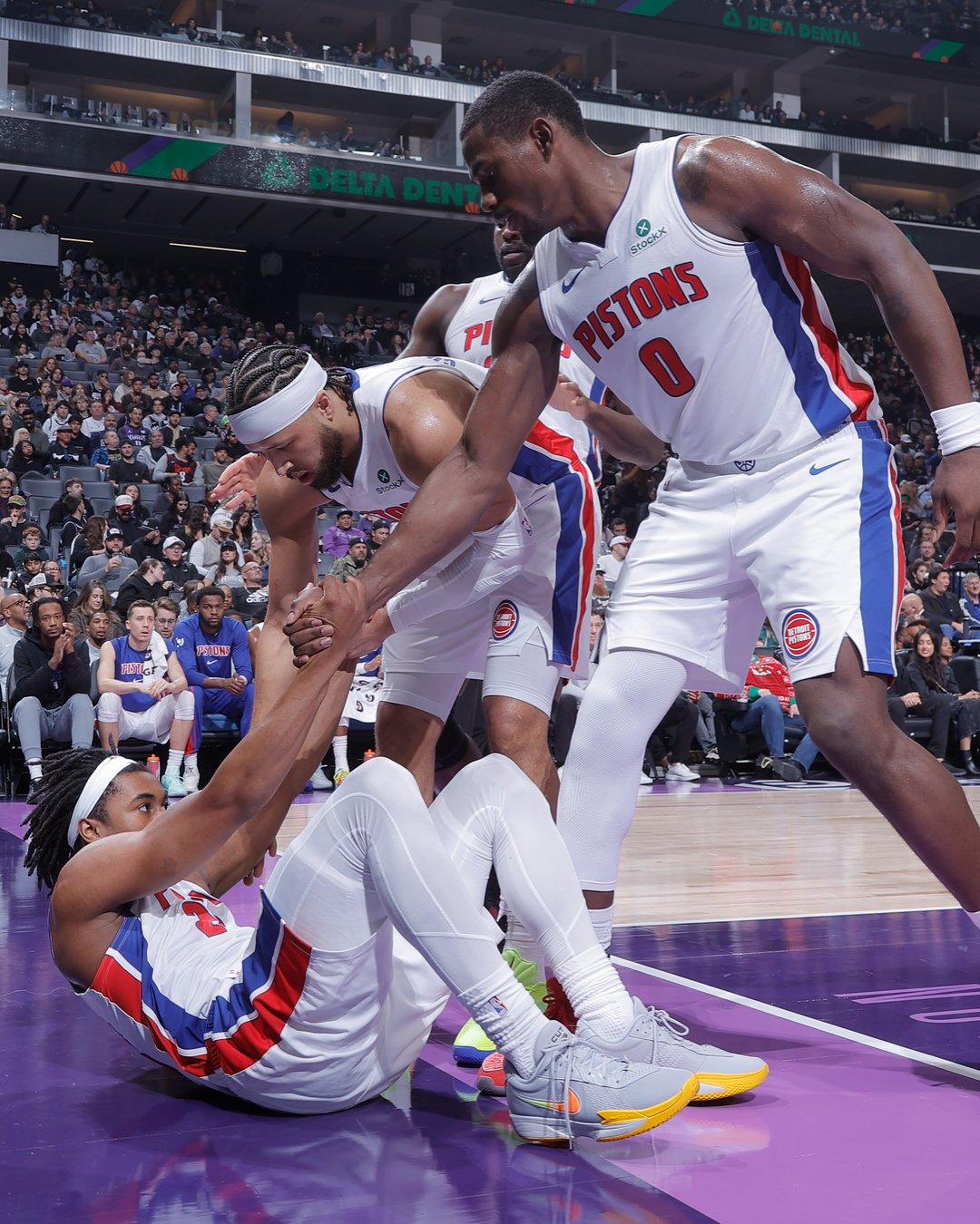 赛后,活塞官方更新X,晒出一张活塞球员凯德-坎宁安和杰伦-杜伦搀扶队友杰登-艾维的赛场照与球迷分享。