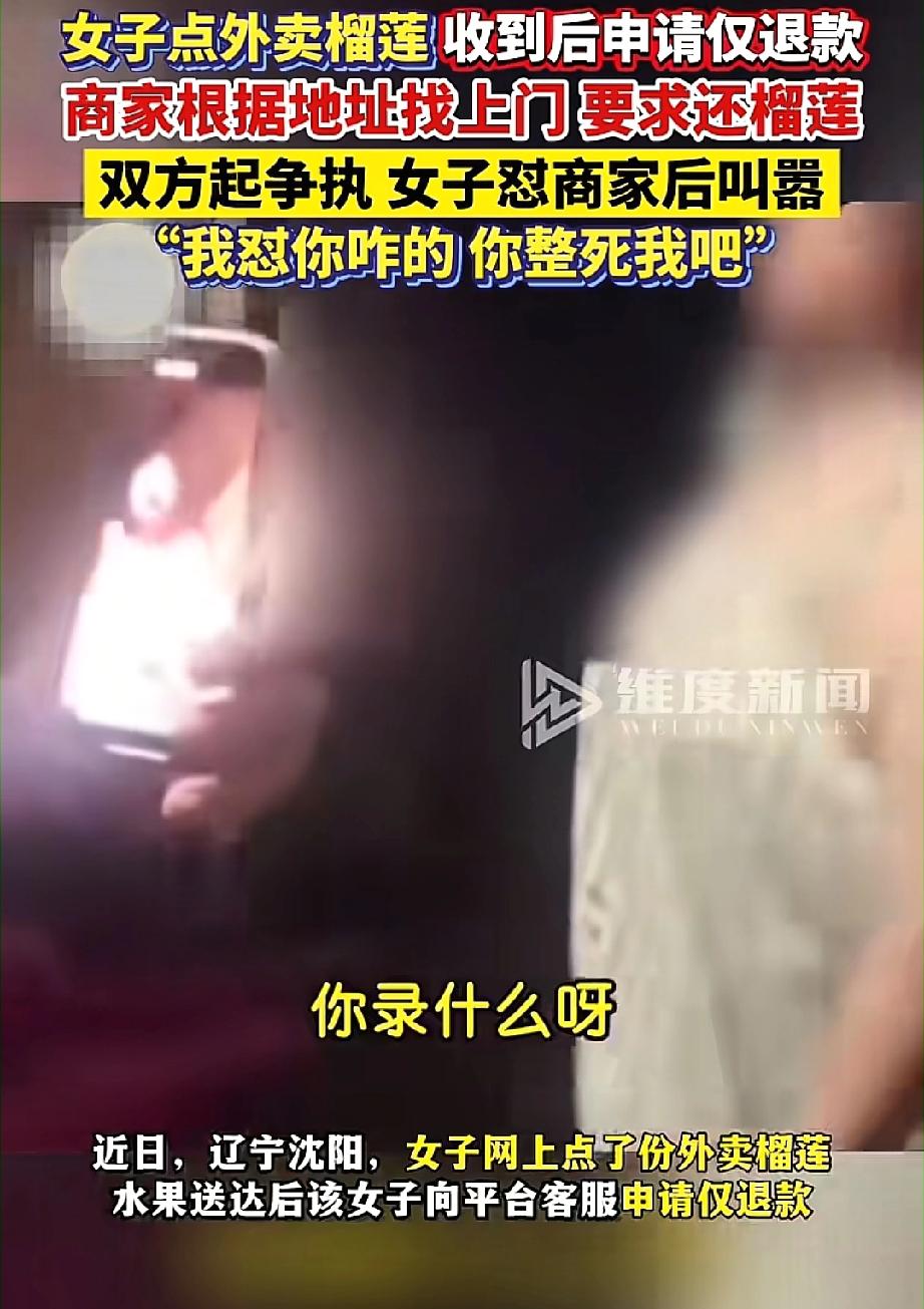 太丢脸了!辽宁沈阳,一名女子在网上订了个榴莲外卖,可刚收到货,就以质量不佳为由申请仅退款。商家越琢磨越气,径直找上门去,却被告知榴莲已被吃掉,女子还指责商家私闯民宅。 事情是这样的,这位女士通过外卖平台下单买了个榴莲。榴莲送到后,她正常吃完,转头就在外卖平台发起售后申请,选了“仅退款”,也就是东西她留下,钱得退给她。 商家收到退款申请后,本小利薄实在承受不起这损失,觉得十分不合理,便依照订单地址找上门来。面对上门的商家,这位女士起初理直气壮,辩解称是榴莲质量不好,“东西不行”所以才要求退款。 商家提出“钱退给你,榴莲给我”。 当商家进一步追问时,她的态度就变了,开始“装糊涂”,最后甚至称自己“吃完精神不好”,妄图用这荒唐理由蒙混过关。整个过程被记录下来,引发大量网友围观与讨论。 有网友说:“这也太过分了!吃了东西给钱理所当然,凭啥白吃?” 咱就说做人最基本的准则就是“拿东西给钱”,商家起早贪黑备货、打包、配送,赚的都是辛苦钱。你平白无故吃了人家的榴莲,一分钱不想掏,这和偷有何区别? 如今赚钱谁容易啊?凭啥让商家为你的贪婪买单?这种不讲诚信的行径,实在令人作呕! 这事看似是吃榴莲不给钱,实则是丢了诚信!咱们过日子,谁都别贪小便宜,想吃榴莲就自己掏钱买,要是收到的东西有问题,想退款也得退货退款,不能吃完就耍赖。 外卖平台遇到这种恶意退款的情况,推卸自己平台的责任,别总让老实商家受委屈。诚信是做人的根本,不管购物还是生活,都得讲良心、守规矩。 只有大家都不贪小便宜,商家诚信经营,咱们消费者也能放心购物,这样多好!你认同吗?