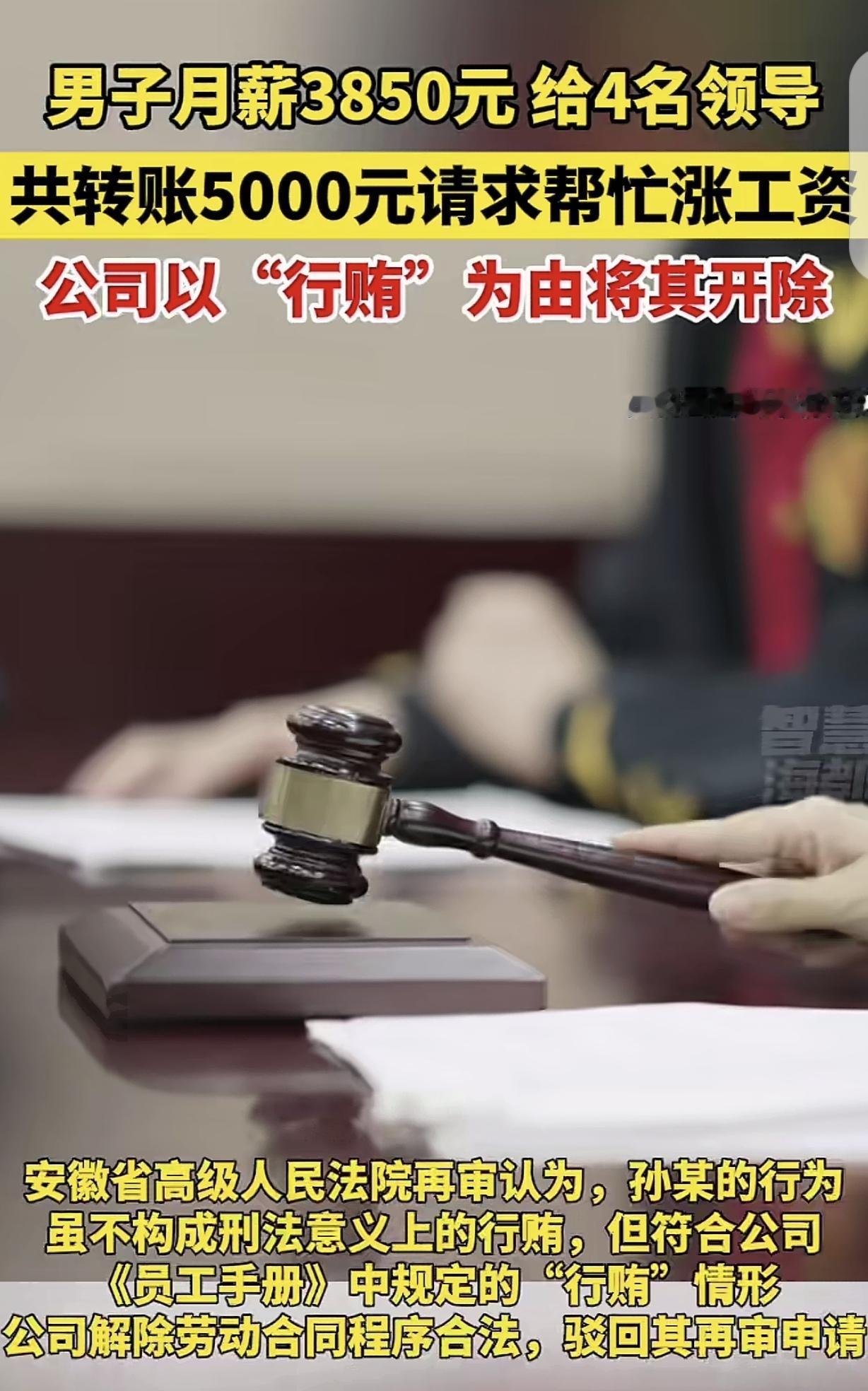 安徽,一男子在物业上班,工资3850元,养活自己都不够,他悄悄给4个上司一共转账5000元,求他们帮自己涨工资,万万没想到,公司却以他“行贿”为由,把他开除了,男子傻眼了,可他不服,申请劳动仲裁,仲裁委要求公司赔偿男子23100元,这回轮到公司不服了,直接把男子告上法庭,一审认为应该支付赔偿金,但二审却有不同看法。网友:看到没?物业公司连自己人都搞,还能指望为业主服务? 孙某每天愁的吃不下饭,睡不着觉,因为他一个大男人,起早贪黑挣的仨瓜俩枣,养活自己都费劲,别说养家糊口了。 孙某在一家物业公司上班,每月也就3850元工资,一天才合一百多块钱,说实话,这点钱,即使孙某每天省吃俭用,自己花都不够,更别说贴补家用了。 这样节衣缩食的日子,孙某是过够了,他决定再把裤腰带勒紧一点,攒出5000元做活动经费,贿赂一下上司,让他们给自己涨涨工资。 孙某一合计,自己有4个上司,不能一棵树上吊死,这4个领导,他都活动一下,到时候东方不亮西方亮,自己升职加薪指日可待。 于是,孙某在少的可怜的工资里,又攒出5000元,天知道这钱他是怎么从牙缝里抠出来的,攒了多久。 案例里没交代孙某是把5000元平均给了4个上司,还是有的上司多,有的上司少,反正礼都送出去了,他就满怀希望的等待着好运降临。 可万万没想到,孙某没等来升职加薪,反而被公司开除了,理由是他行贿。 孙某立马傻眼了,他千算万算,都没想到会是这个结果,这就叫“偷鸡不成蚀把米”吗? 孙某不服呀,他觉得自己即使错了,以后不再犯就是了,至于把他饭碗砸了吗? 孙某申请劳动仲裁,仲裁委认为物业公司属于非法解除劳动合同,要求公司赔偿孙某23100元。 这回该轮到物业公司不服了,公司提起诉讼,把孙某告上法庭,但一审认为,公司一口咬定孙某违背了公司规定,但公司旧版《员工手册》并没有禁止行贿这一说。 而公司的新版《员工手册》的制定和公示,都存在很大的问题,所以认为公司开除孙某。属于违法解除劳动关系,应该赔偿孙某。 公司继续不服,再次提起上诉,二审和一审意见不一样,二审认为,公司不应该赔偿孙某,理由是,既然孙某已经签收了新版的《员工手册》,说明他认同了,接受了公司规定。 但孙某还是无视规定,私下给4个上司发红包疏通关系,已经违反了公司的规章制度,他被辞退,一分赔偿都没有。 这回,孙某彻底傻眼了!到头来没涨工资,工作都弄丢了,真是得不偿失呀! 不仅不能开除,还要实际去了解职工困难,解决生活困难!批评教育即可,为了避责,只是惩办,已经侵害了权益! 孙某这样做,肯定是公司有其他人通过类似手段进行了加薪或升职。肯定有其他成功的,要不然也不会出现这样的事,肯定是其他4个上司觉得别人都是给2~5万,你给1000多就想加薪,没情商就干掉了。 孙某一个大老爷们,起早贪黑干物业,3850块的工资在如今这年头,别说养家,连自己吃顿像样的饭都紧巴。 他愣是从牙缝里抠出5000块,想着给四个领导“意思意思”,指望着能涨点工资,这法子蠢是蠢了点,可细想想,不是被逼到绝路上,谁愿意拿自己活命钱去赌这一把? 结果呢?钱送出去了,工资没涨,反被扣了个“行贿”的帽子一脚踢出大门。 更憋屈的是,劳动仲裁还判公司赔钱呢,二审法院一锤子又给砸回去了,说他自己签了员工手册活该! 这叫什么事儿?合着公司新版手册写得不清不楚,公示得不明不白,最后倒成了孙某的“认罪书”?这理儿到哪儿也说不通! 最寒心的是物业公司这做派。自家员工穷得揭不开锅,不想着怎么解决实际困难,倒把“行贿”的帽子扣得又快又狠。 这架势,连自己人都往死里整,还能指望他们真心实意为业主服务?孙某这钱送得是糊涂,可公司这“挥泪斩马谡”的戏码,明摆着是怕担责、怕惹腥,拿个小员工开刀立威呢! 要我说,这事儿里外透着荒唐。孙某是病急乱投医,可公司更是冷血又短视。 但凡上司们有点人性,私下批评教育,帮着解决点实际困难,何至于闹到对簿公堂? 这结局,孙某丢了饭碗,公司寒了人心,双输!说到底,压榨员工的根子不除,今天少了个“行贿”的孙某,明天保不齐又冒出个“跪求”的李某,这道理,某些公司怕是装睡到底了! 《劳动合同法》第39条第2项规定:劳动者“严重违反用人单位的规章制度”的,用人单位可以解除劳动合同。 孙某为涨薪向4名领导转账5000元,虽不构成刑法行贿罪,但公司新版《员工手册》明确禁止“行贿”行为。孙某已签收该手册,其行为被认定为违反公司规章制度。 二审认为,公司依据《员工手册》解除劳动合同符合《劳动合同法》第三十九条。即使孙某生活困难,但以金钱“疏通关系”破坏职场公平,属于“严重违反规章制度”。 一审曾以《员工手册》制定程序存疑判公司赔偿,但二审查明孙某签收即视为认可制度效力,故改判公司无需赔偿。 关注@灋律盐究员 学法辩是非,用法止纷争。