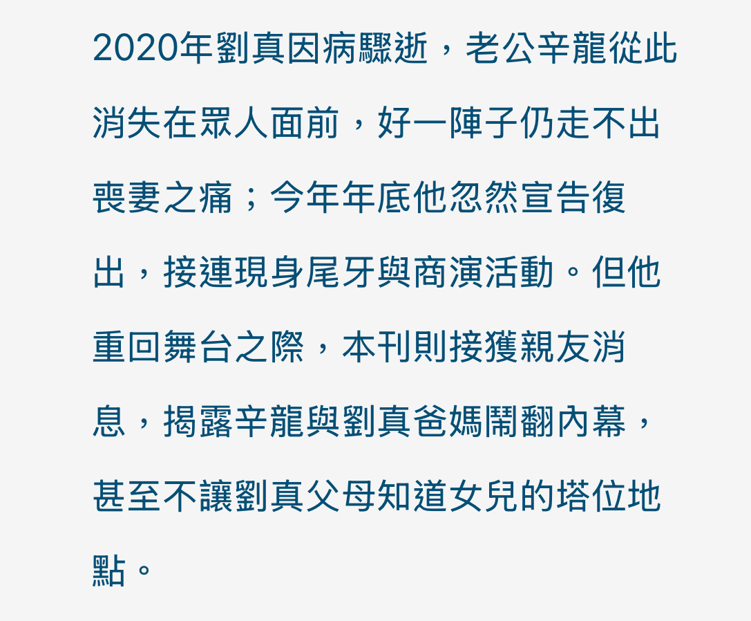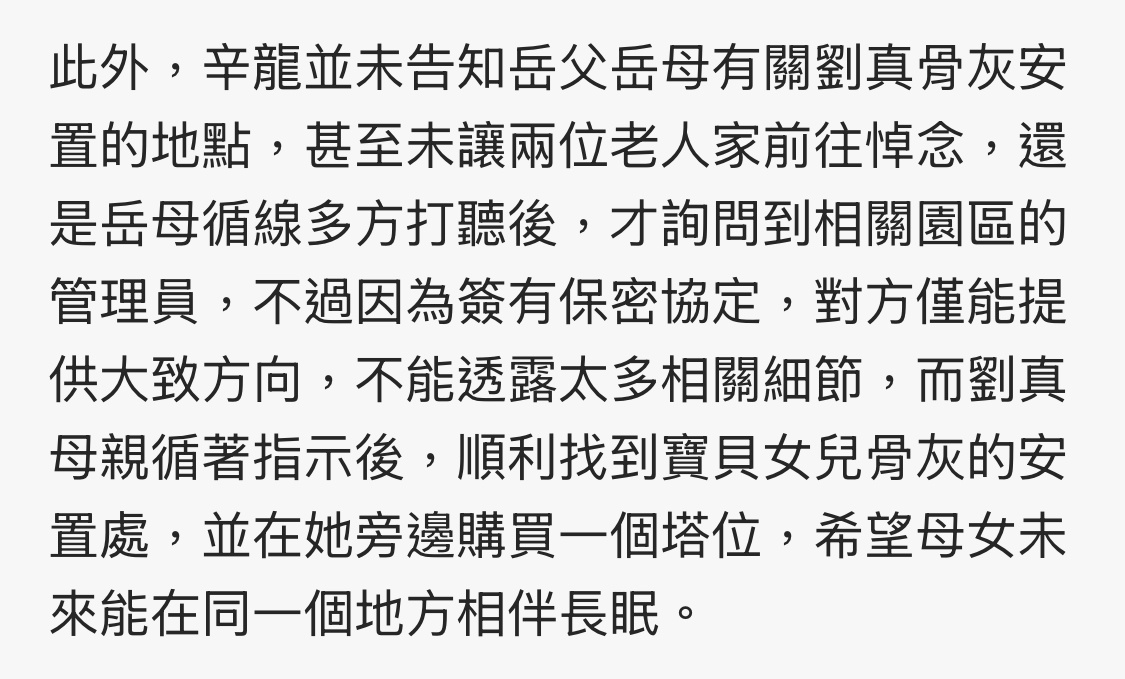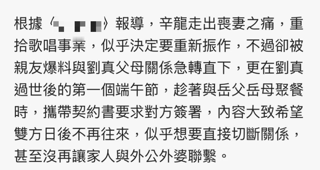 台媒爆料辛龙隐瞒刘真葬在哪里,不让岳父母看望刘真,也不让岳父母见刘真的女儿。爆料的真实性应该蛮大的,因为是亲友向周刊爆料。 不太理解,辛龙这是和岳父母有什么仇吗?为什么不肯告诉岳父母刘真葬在哪里?而且,还要签断绝关系书,和岳父母不再来往。