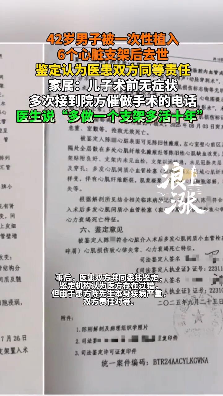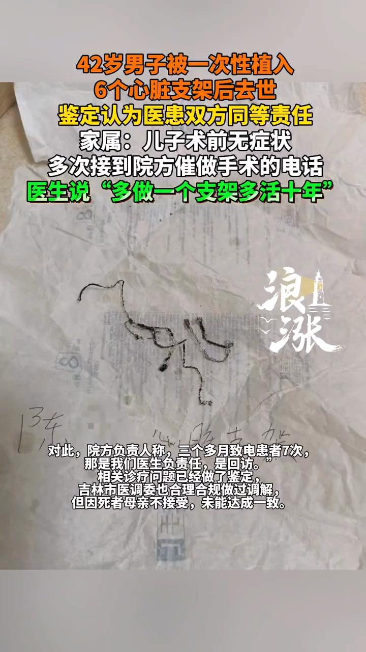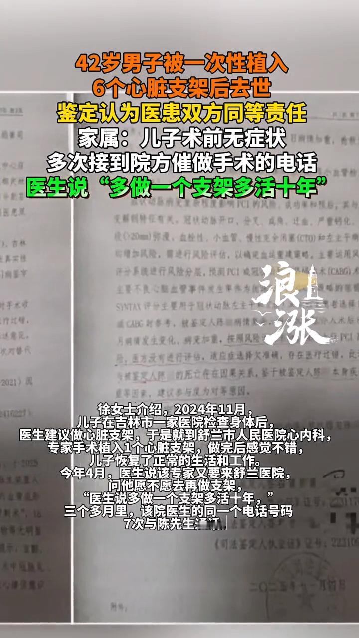 42岁男子心脏手术一次性植入6个支架,导致心脏骤停,最后抢救无效死亡,家属称是医院说一个支架可多活10年。 近日,吉林省舒兰市的徐女士称,自己42岁的儿子,在当地人民医院进行心脏支架植入手术,一次性植入了6个支架,结果手术后半小时心脏骤停。 后来虽然进行了抢救,但还是在8天后身亡。徐女士称,自己的儿子做支架植入前,身体并没有不适。 徐女士说之前儿子心脏不舒服,去看了专家,专家说需要植入支架,于是儿子就去了人民医院植入了一个支架,后来感觉效果还不错。 然后,后面人民医院就经常给儿子打电话,还说多植入一个支架可以多活十年。 对此说法,医院方面不认可,称给徐女士儿子多次致电,是术后回访,是对患者负责。 后来经过医疗鉴定,病人和医院各自承担一半责任,对此徐女士无法接受。当地有关部门进行了多次调解,徐女士均无法接受。 这件事,折射出了一个很实际的问题:过度医疗。笔者认为,这事医院的责任其实更大。 为什么这么说呢?因为医院和医生作为专业机构和专业人士,很多时候,患者对于医生的话都是无条件信任的。 患者自己没有能力对自己的病情做出准确清楚的判断,而很多时候只能无条件相信医生。 患者在这里面本来就是弱势的一方,这也是很多过度医疗事件发生的原因。 要改善这种情况,关键还是得从医院和医生着手,这才是最关键的一步。