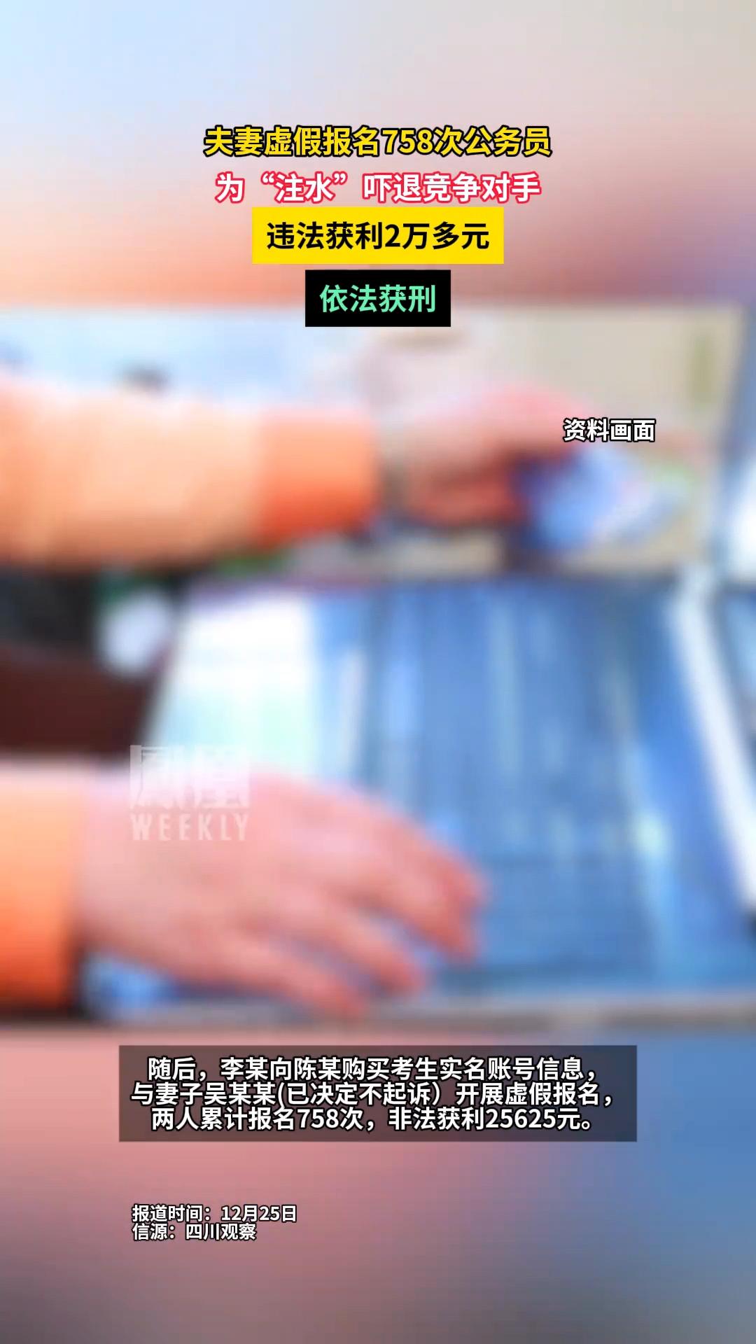 这真他娘的是人才啊! 夫妻俩考公务员,虚假报名7589次。 只为了营造很多人报名的假象,吓退真的想报考的人。 男子李某为了考公务员,报名了一家培训机构去上课。这家机构的培训老师周某找到李某,称有办法可以提高考上的概率。 李某赶紧询问,周末说只要他们用其他人的身份信息去报名,真的想考这个岗位的人,一看报考的人这么多,就不会报了。 李某一听,果然妙计。于是当即同意,他和自己的老婆去通过非法途径购买了一批真实身份信息并进行报名,一共虚构了758个考生。 结果,好巧不巧,这758个人中竟然真的有一个人要报考公务员,在报名的时候发现自己的身份信息被占用了,于是就牵扯出了这起案子。 经过审理,李某和周某被判刑,而李某的老婆则免于起诉。 这事,真的是震碎了三观!咋想都想不到,居然还有这种骚操作。 不过打铁还需自身硬,要有真本事才能成功,靠一些非正常手段,最终只会反噬自己。
