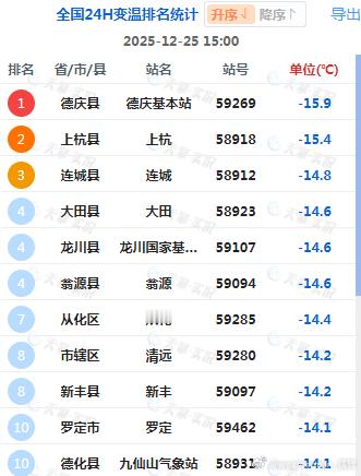 【降温】今天东北以及福建广东等地因为冷空气影响,出现6-14℃降温,广东福建局地降温15℃左右。广东德庆降15.9℃、福建上杭降15.4℃、连成降14.8℃,为15时全国降温前三站点。德庆今天气温几乎躺平。哈尔滨今天大部分时间气温低于零下20℃,13-14时短暂摸高零下19.8℃。