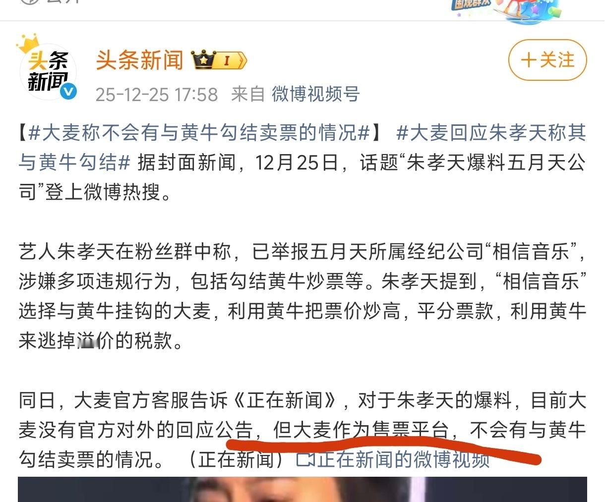 朱孝天昨天的一个词条💥了。大麦回应了说 作为平台不会和黄牛勾结卖票。大麦否认与