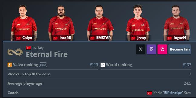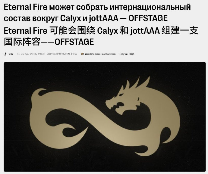 虎扑12月25日讯根据offstage.ru的报道,土耳其电子竞技组织EternalFire可能会组建一支国际CS2战队,其中包括本土选手Calyx和jottAAA。EternalFire目前的纯土耳其阵容碌碌无为,在V社世界排名中位列第115名。