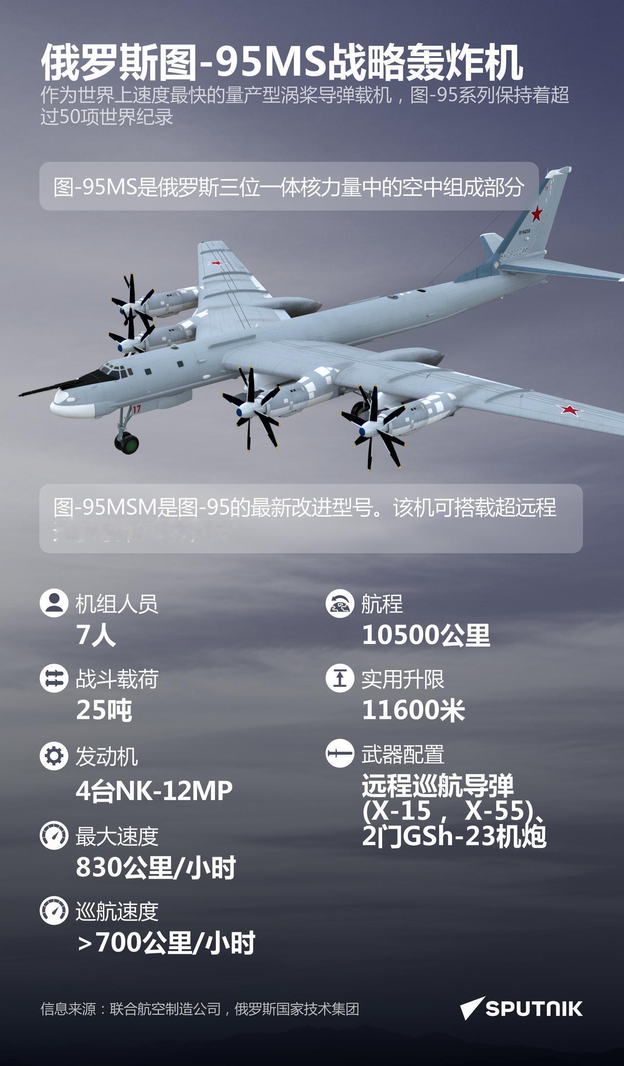 俄图-95MS战略轰炸机:“空中巨熊” 俄罗斯卫星通讯社 2025年12月25日, 18:45 图-95MS战略轰炸机作为俄罗斯三位一体核力量中的空中组成部分,已服役超过半个世纪。 图-95飞机曾是其所处时代的挑战者,直至今日依然如此。图-95MSM是图-95的最新改进型号。该机可搭载超远程巡航导弹X-101/102。 有关图-95MS性能的更多详情,请见俄罗斯卫星通讯社信息图。