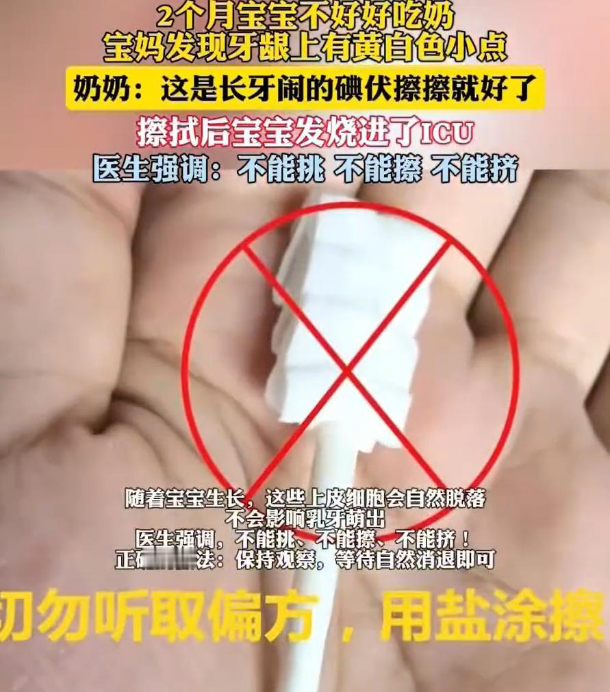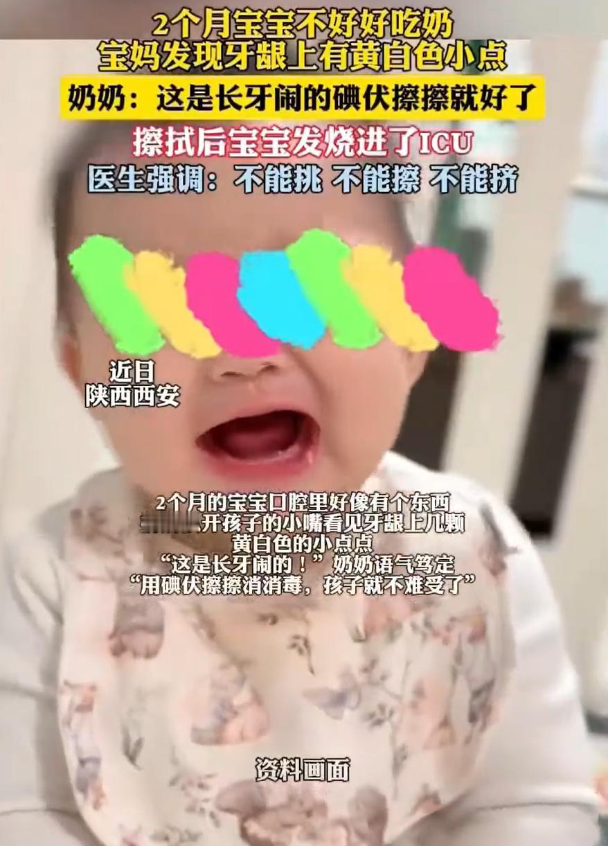 陕西西安,一位宝妈在家里带2个月的孩子,偶然发现孩子的嘴里好像有个东西,就询问经验更丰富的婆婆,没想到,孩子奶奶带上老花镜看了一眼,就直接拿出碘伏消毒,可没想到,这一举动,却把孩子送进了医院 奶奶看到孩子的牙龈上有几颗黄白色的小点点,她当场就认定这是宝宝长牙闹的,说用碘伏擦擦消消毒孩子就不难受了。不等妈妈仔细思考,奶奶已经找来干净纱布,蘸上碘伏就往宝宝牙龈上擦拭 没想到,孩子不久就开始剧烈哭闹,额头滚烫,呼吸也变得急促起来。夫妻俩赶紧带孩子去医院,急诊时宝宝已经出现呼吸加快、精神萎靡的症状,医生立即展开了紧急救治 医生说得很清楚,那不是长牙,也不是脏东西,而是马牙。几乎一半的新生儿都会有,只是有的明显,有的不明显。它不是病,不疼不痒,也不需要处理,等孩子长大一点,自然就没了。真正需要做的事情只有一件,别动它 很多类似的意外,根源都不在恶意,而在过度自信。老一辈带孩子,靠的是经验,年轻父母带孩子,靠的是信息。两套东西撞在一起,很容易出问题。经验如果不更新,就会变成风险。碘伏对成年人是消毒,对新生儿的口腔却可能是刺激源,甚至会误服 在我看来,孩子越小,越不能靠想当然。不处理,本身也是一种正确处理。能忍住不动手,比急着做点什么更重要