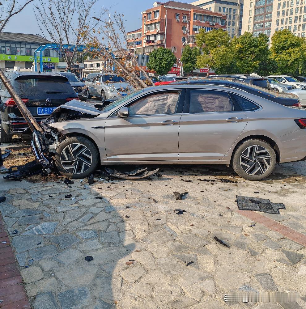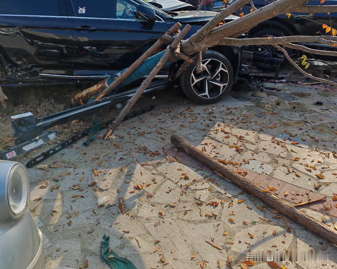 洗车的师傅也猛,不熄火就给他洗车了? 停车场事故,毁掉三部车。据说是车主在停车场洗车,脚垫压上了油门。两部车完全报废,一部车要大修。两小时再去,除了树上擦掉树皮,车祸痕迹已经清除了。