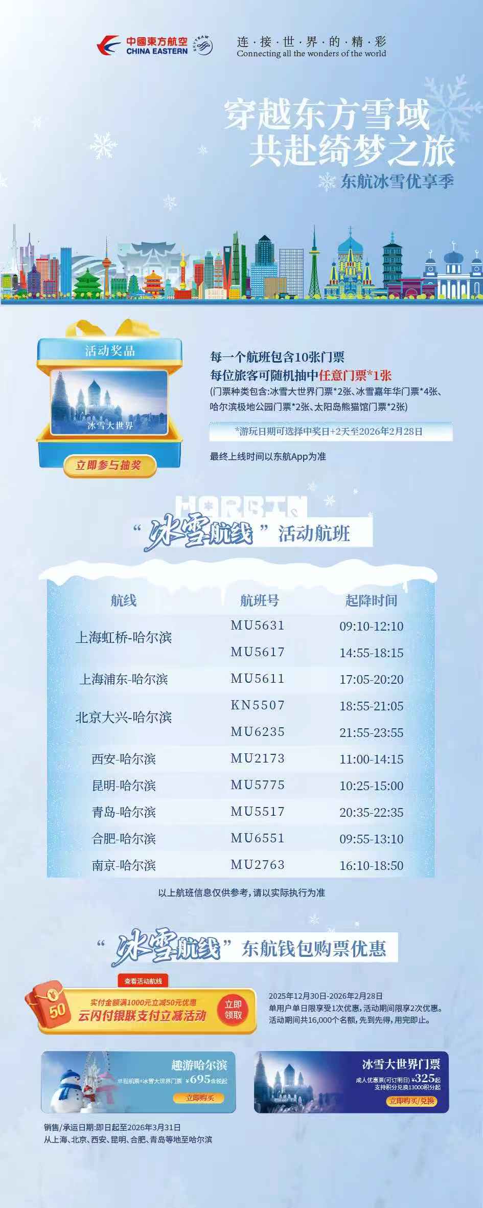 启动仪式当天,东航上海—哈尔滨MU5631航班化身“冰雪主题空中客厅”。2025年12月26日至2026年2月28日活动期间,东航将在上海虹桥、浦东等八个机场始发的每日十个飞往哈尔滨的航班上,标配马迭尔集团提供的特色机上配餐,让旅客在万米高空就能品味地道东北风味。除了味觉惊喜,活动更推出多重专属权益,包括热门景区门票专属福利、马迭尔旗下餐饮折扣券、东航App的专属活动等。