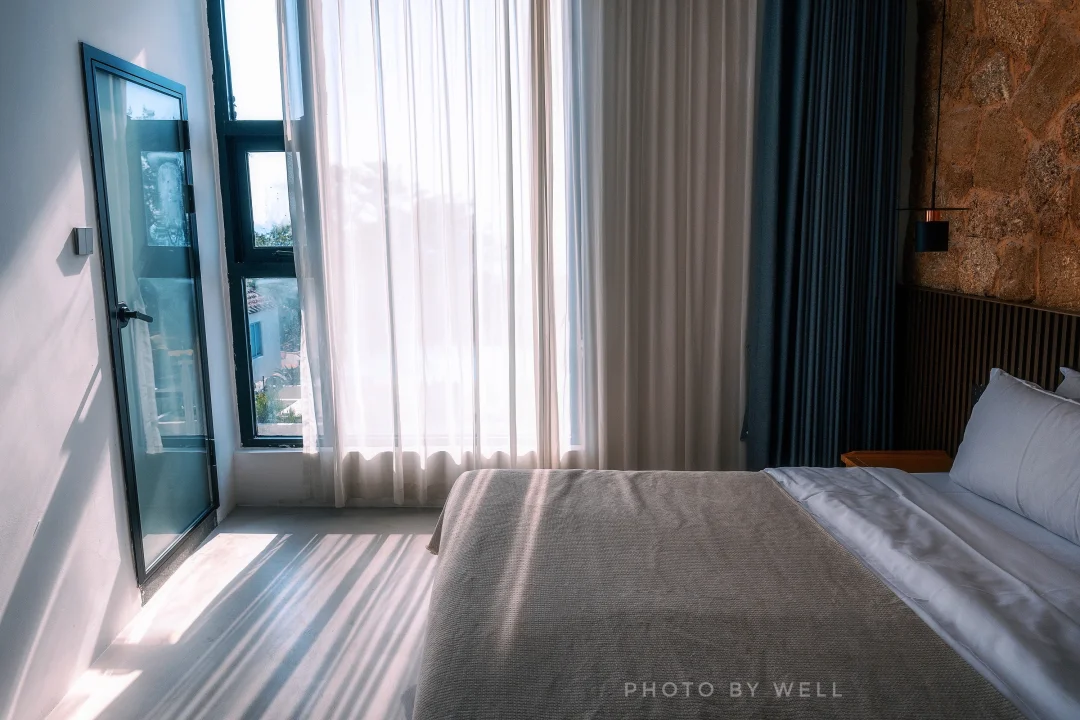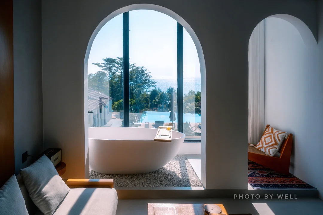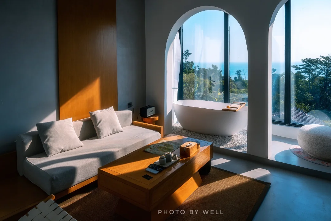 酒店只有8间客房,每间都是一室一厅的套房设计,把休息与休闲空间完美分开。我们入住的是畔海大床套房,180度超大落地窗将海景框成巨幅画作,躺在床上就能迎接绝美日出日落。浴缸正对大海,傍晚一边泡澡一边欣赏落日余晖,这才是真正的度假体验。