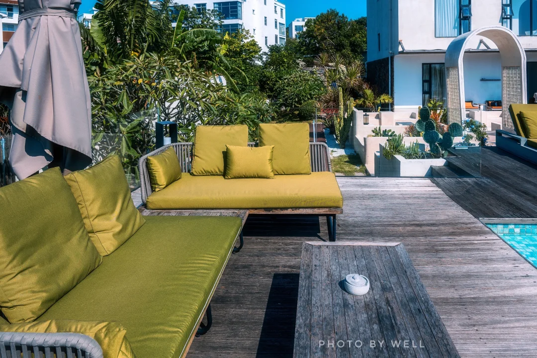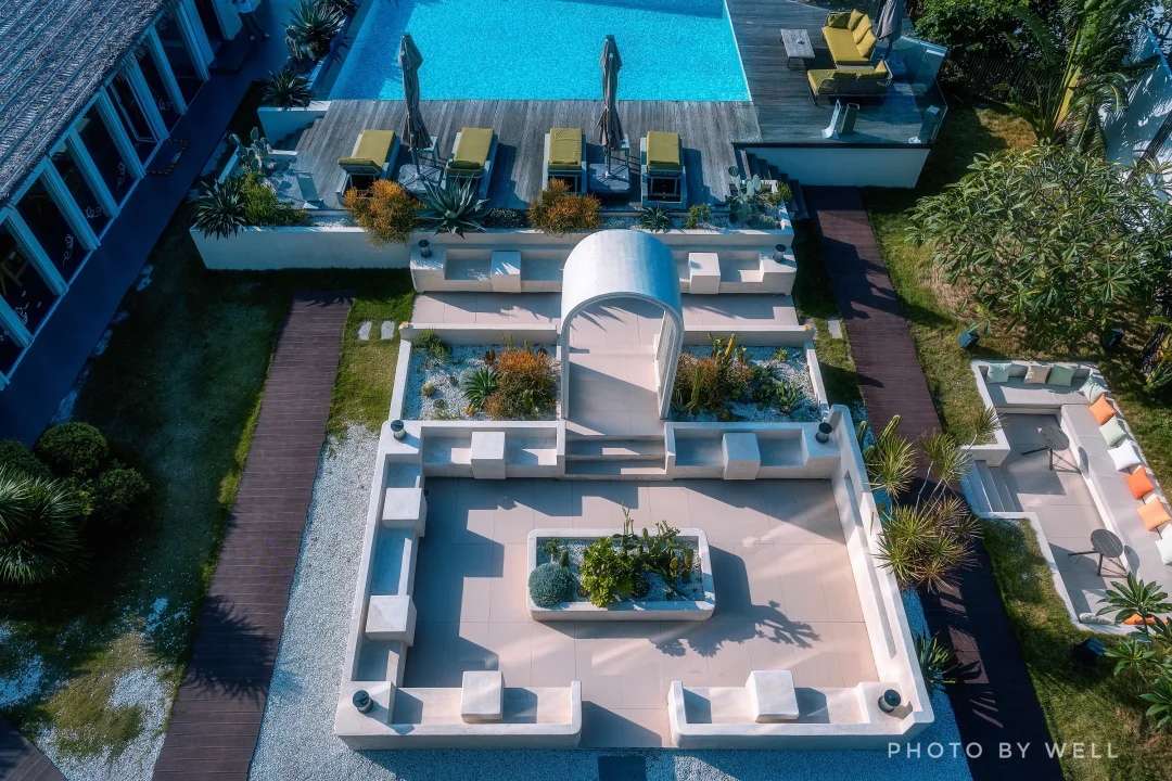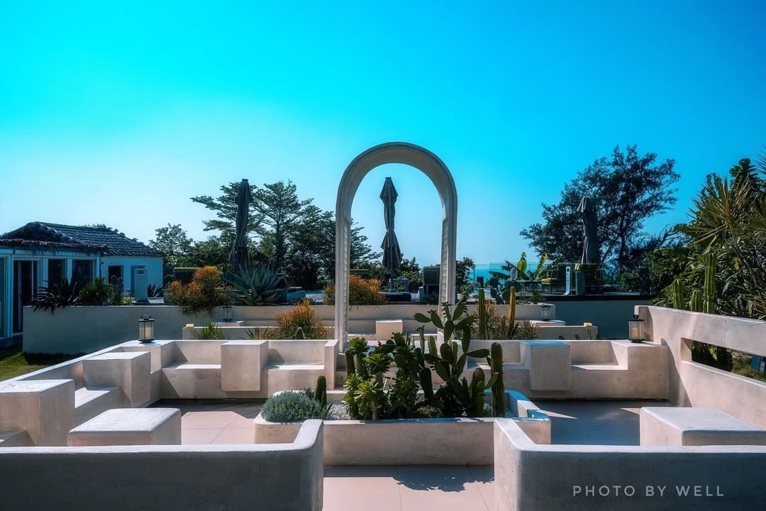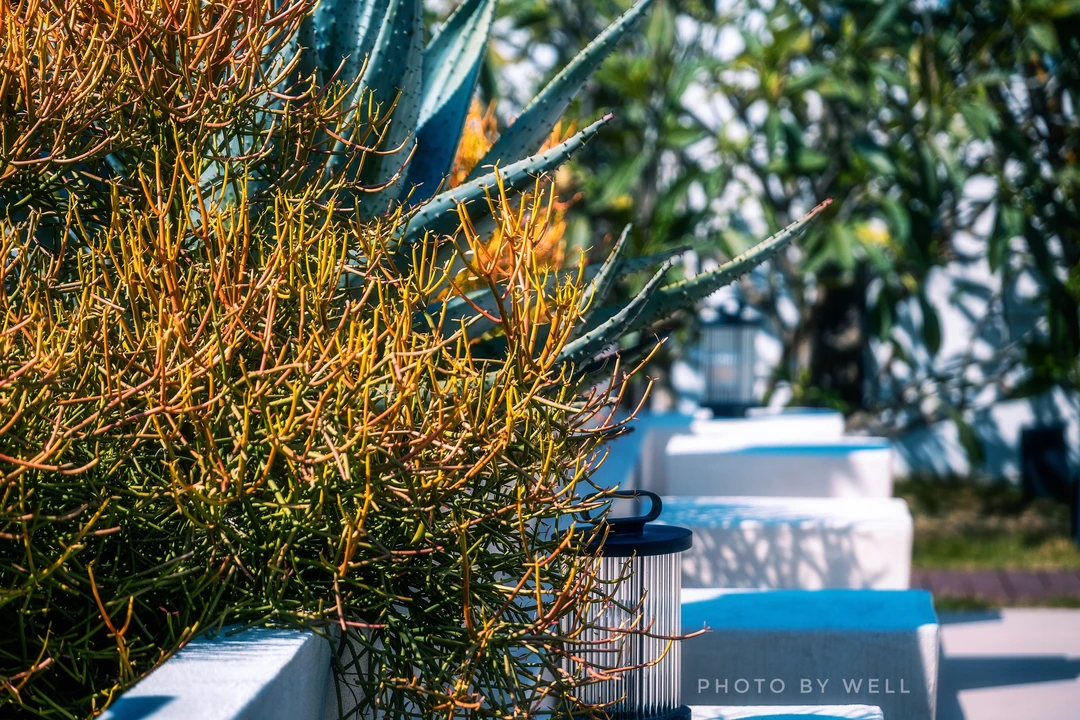 酒店的院子不大,但种满了各式热带植物。走入庭院,仿佛进入了某个东南亚的度假地,仙人掌与各色绿植错落有致,纪念碑谷般的建筑设计让人眼前一亮。无边泳池的池水与远处的海天连成一片,蓝得让人心醉。管家介绍,这里建筑由天然珊瑚石构建而成,融合了现代诧寂风设计,既保留了涠洲岛的原始美感,又不失现代舒适性。