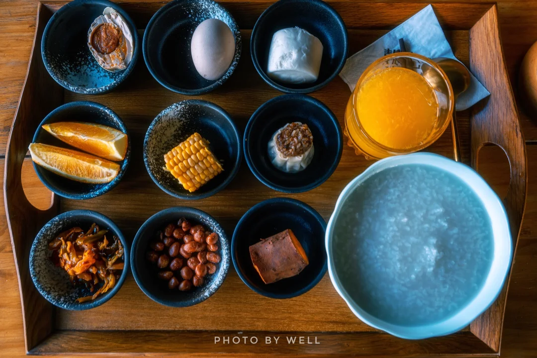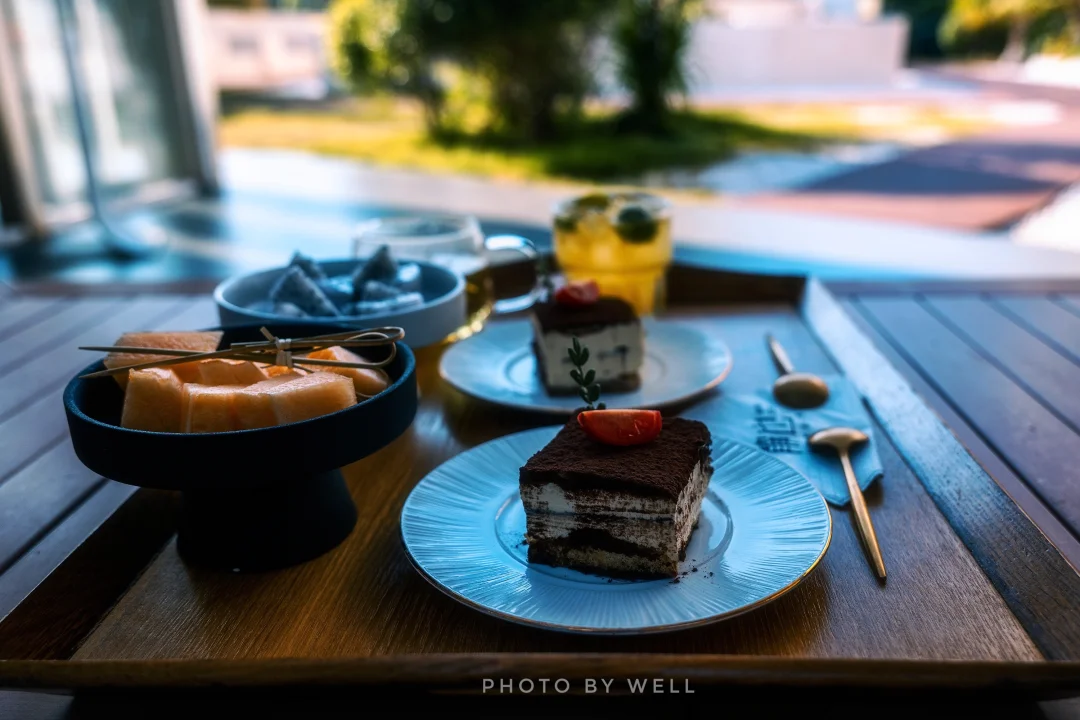 静也的早餐选择也很多,中西式6种主食选择,配上6 ~9种小食和7 ~8种饮品。我尝试的是有粥的中式套餐,清爽的小菜搭配当地特色粥点,口味恰到好处。酒店的下午茶也很精致,托盘上摆放着手冲咖啡、甜品和新鲜水果,我们端着托盘走到顶楼海景露台,眼前是无边的大海,耳边是轻柔的海浪声,这份惬意让人舍不得离开。