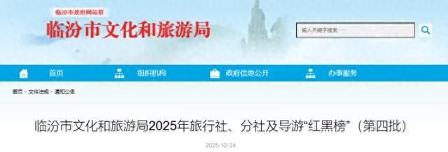 为进一步加强和规范旅行社市场经营行为,强化守信激励和失信惩戒力度,提高旅游行业和从业人员的诚信经营、诚信服务水平,提升旅游服务质量,按照《临汾市旅行社、分社及导游“红黑榜”制度(试行)》,现发布临汾市2025年旅行社、分社及导游“红黑榜”第四批,名单如下:
