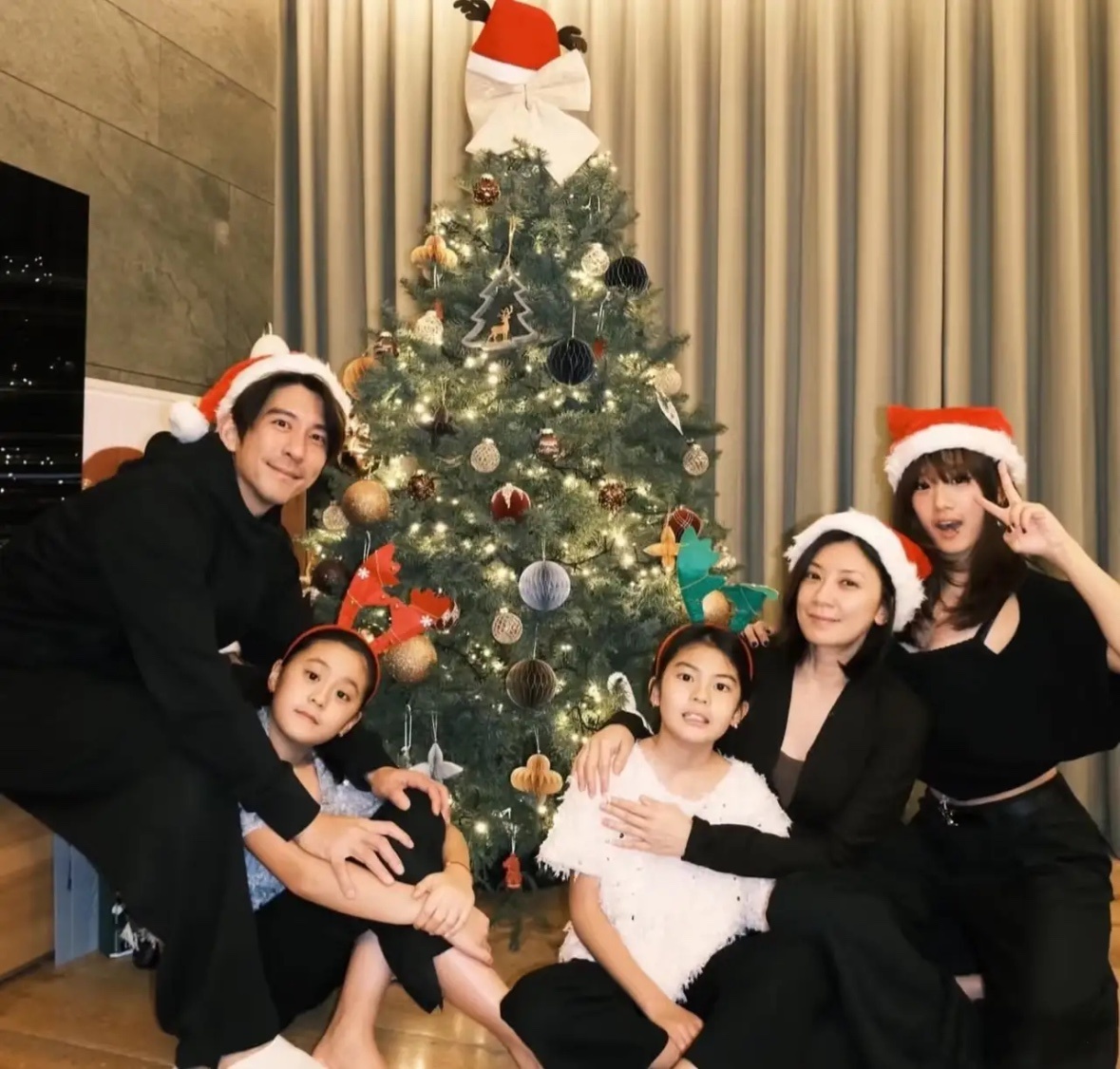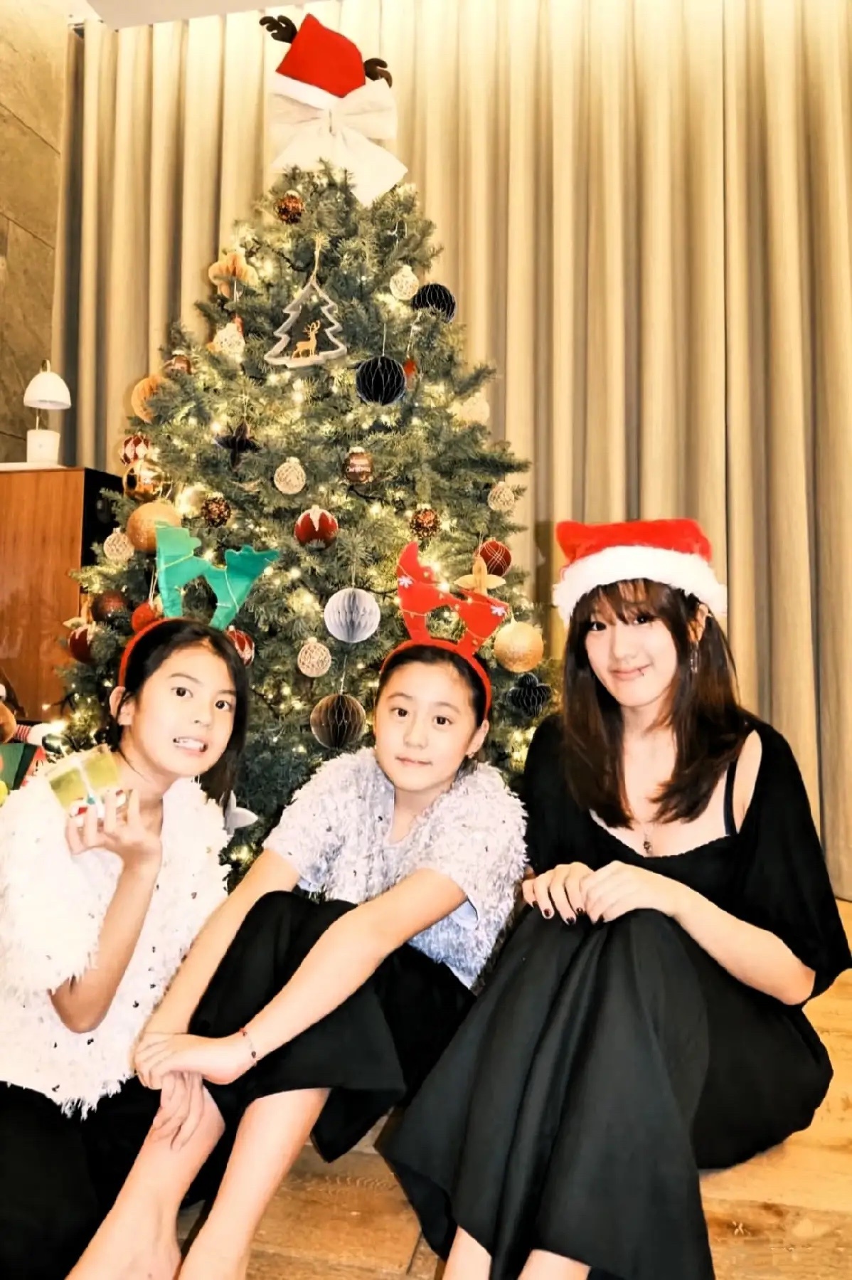 贾静雯一家子齐齐整整过圣诞,大女儿梧桐妹也在一起。贾静雯和老公都戴着圣诞帽,穿
