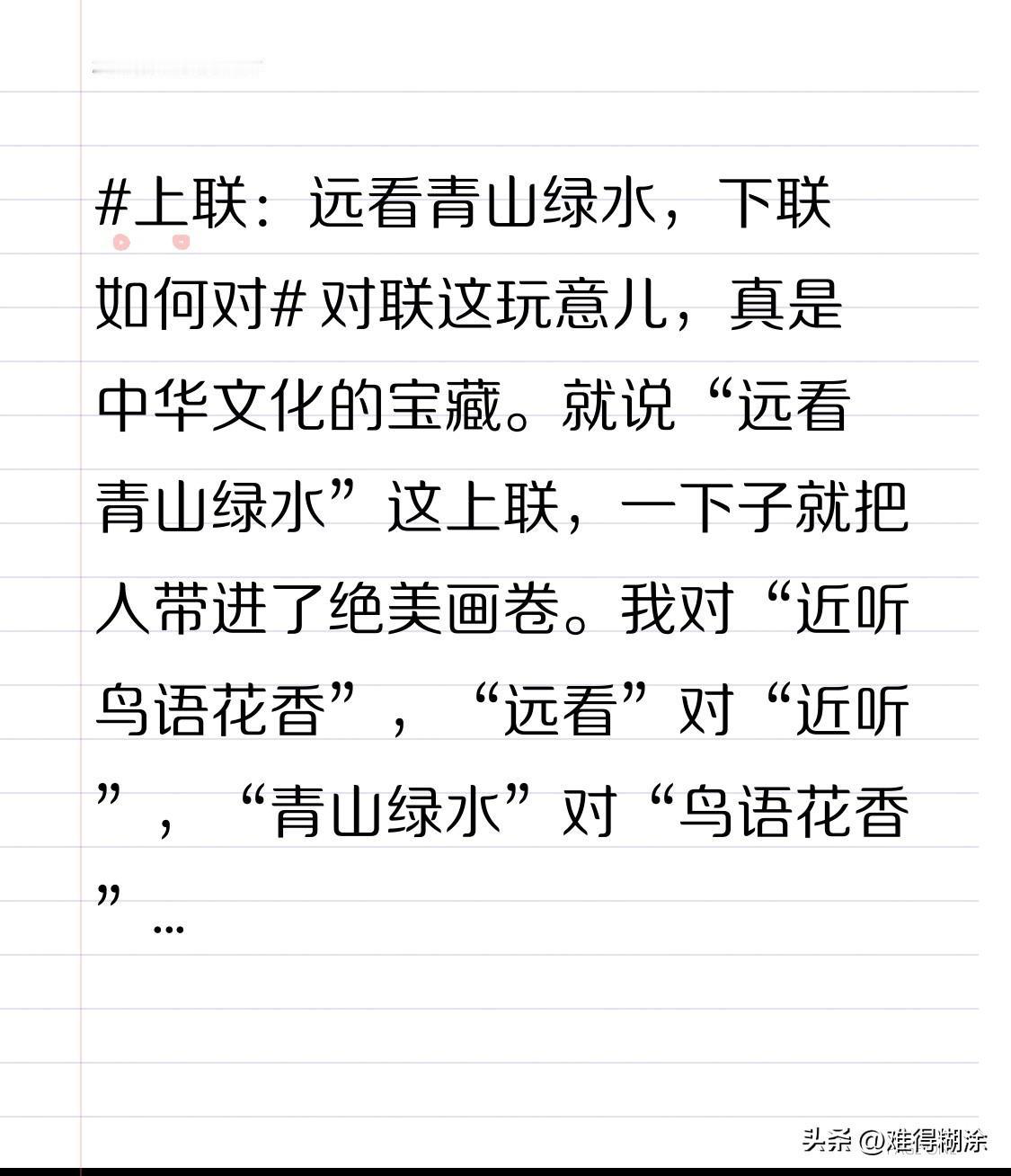 对联这玩意儿,真是中华文化的宝藏。就说“远看青山绿水”这上联,一下子就把人带进了绝美画卷。我对“近听鸟语花香”,“远看”对“近听”,“青山绿水”对“鸟语花香”,对仗工整。 我想起去乡下,村口望是“远看青山绿水”,进院便有“近听鸟语花香”。对联虽短,却让我们留意身边美好。你觉得我这下联咋样?