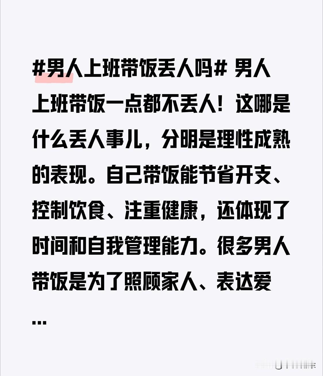 男人上班带饭一点都不丢人!这哪是什么丢人事儿,分明是理性成熟的表现。自己带饭能节省开支、控制饮食、注重健康,还体现了时间和自我管理能力。很多男人带饭是为了照顾家人、表达爱意,多靠谱啊。别被传统观念束缚,认为男人就得下馆子才显面子。带饭上班,既健康又省钱,多好!