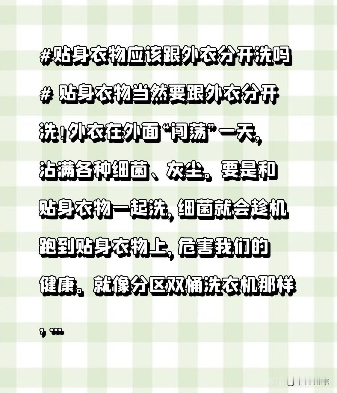 贴身衣物当然要跟外衣分开洗!外衣在外面“闯荡”一天,沾满各种细菌、灰尘。要是和贴身衣物一起洗,细菌就会趁机跑到贴身衣物上,危害我们的健康。就像分区双桶洗衣机那样,让内衣外衣分开洗,不混染,干净又安心,家人衣物各归其位,多省心呐!别偷懒,为了健康,分开洗才是正解。