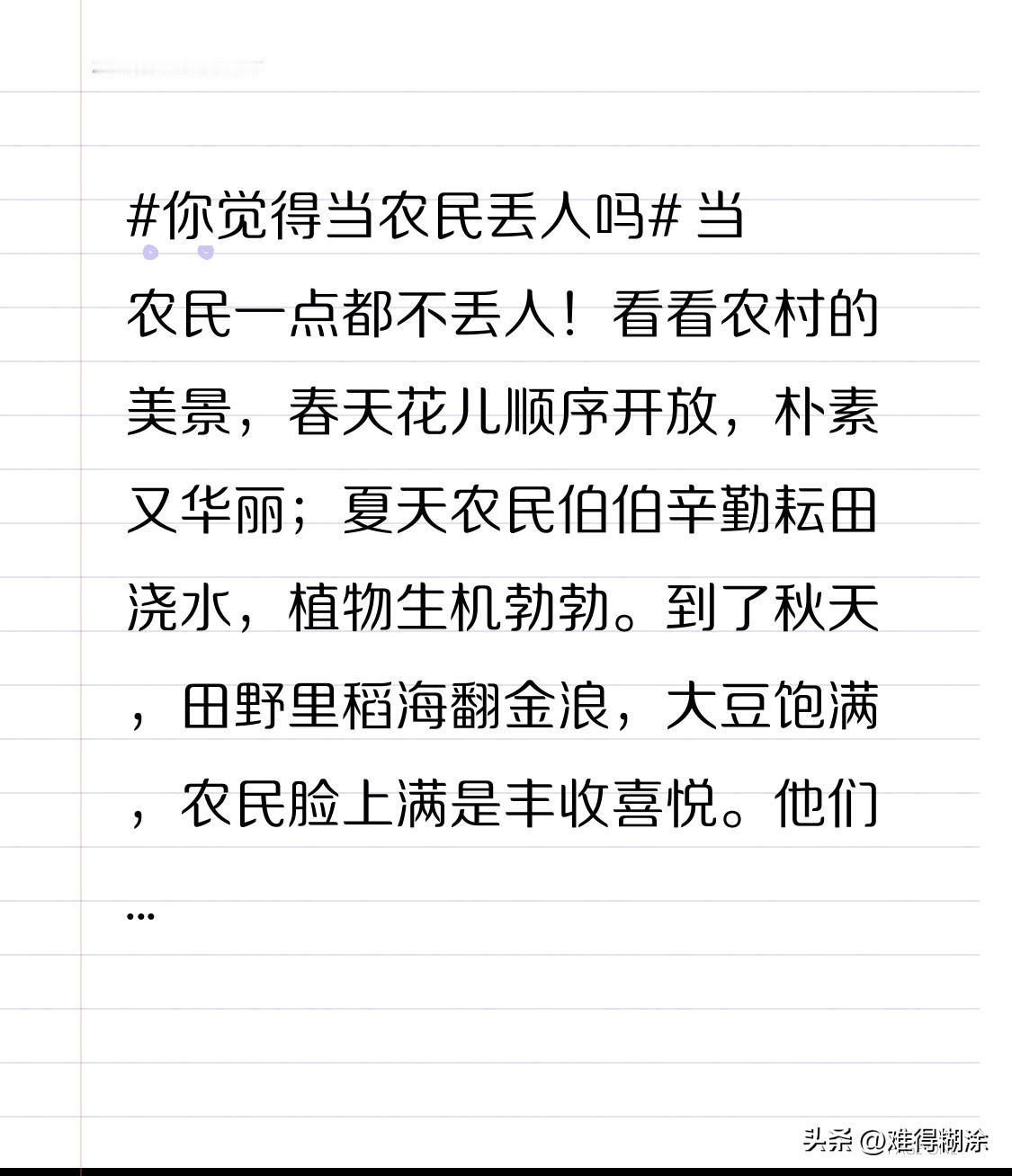 当农民一点都不丢人!看看农村的美景,春天花儿顺序开放,朴素又华丽;夏天农民伯伯辛勤耘田浇水,植物生机勃勃。到了秋天,田野里稻海翻金浪,大豆饱满,农民脸上满是丰收喜悦。他们用双手创造价值,为大家提供粮食,这是值得尊敬的职业,有啥丢人的?